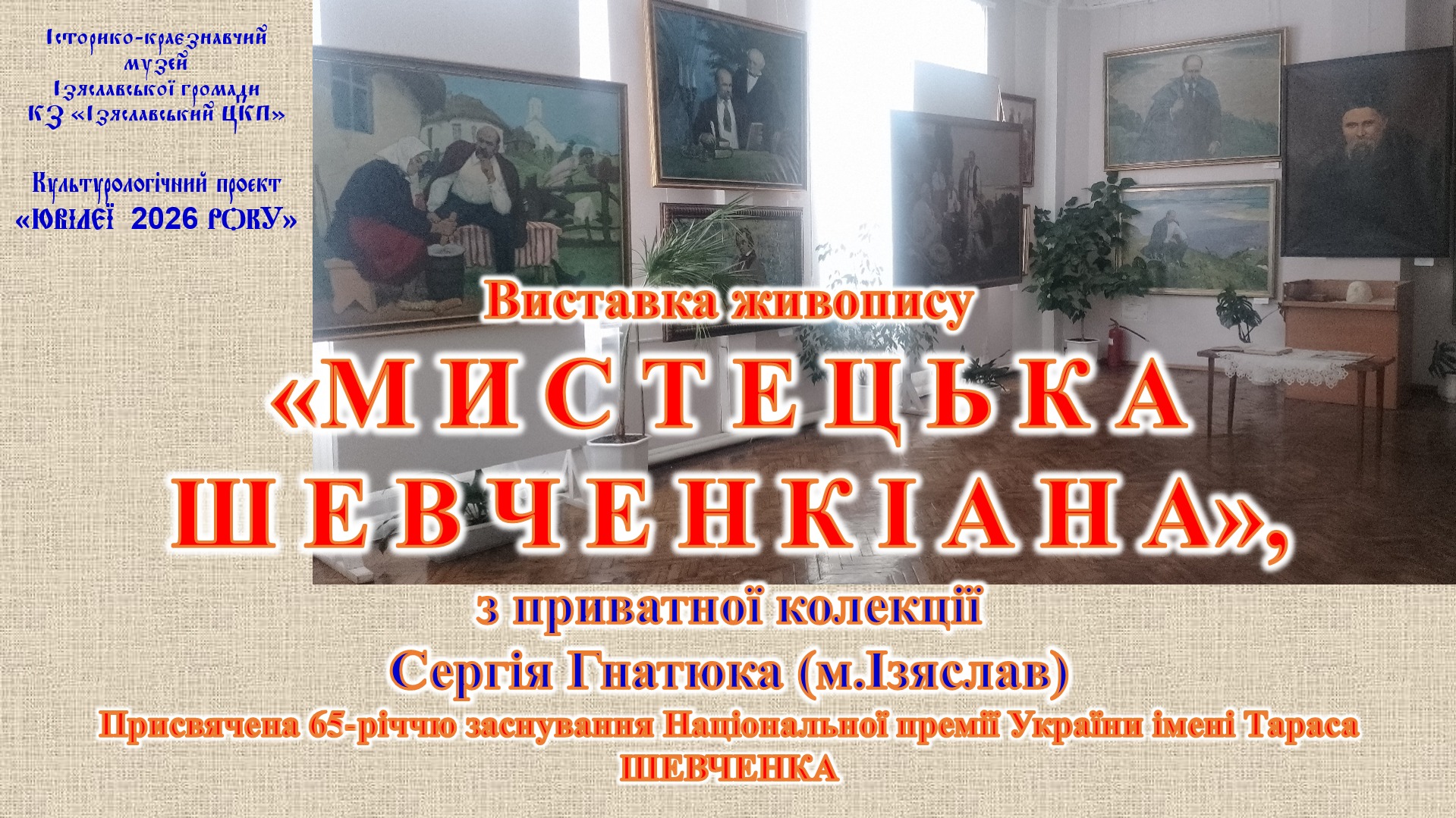 В період із січня по травень 2026 року в мистецькій галереї історико-краєзнавчого музею Ізяславської громади КЗ «Ізяславський центр культурних послуг» діє виставка «МИСТЕЦЬКА ШЕВЧЕНКІАНА».