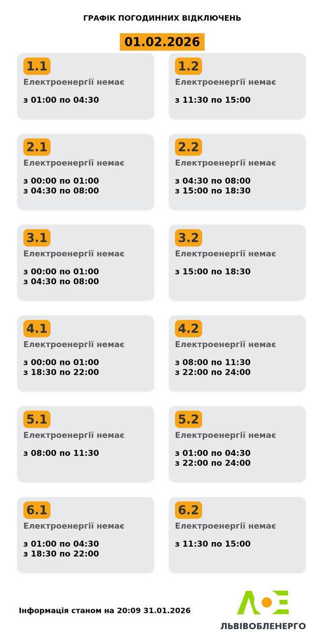 Добрий вечір! Навіть у темряві ночі ми продовжуємо світитися – кожен із нас є промінь для України. Дякуємо Богу та ЗСУ за прожитий день. Нехай завтра подарує більше радості й моментів, від яких хочеться жити!Зберігаємо спокій. Віримо в ЗСУ. Чекаємо мирного світанку! 🫶🔌💡ГПВ на 1 лютого⤵️