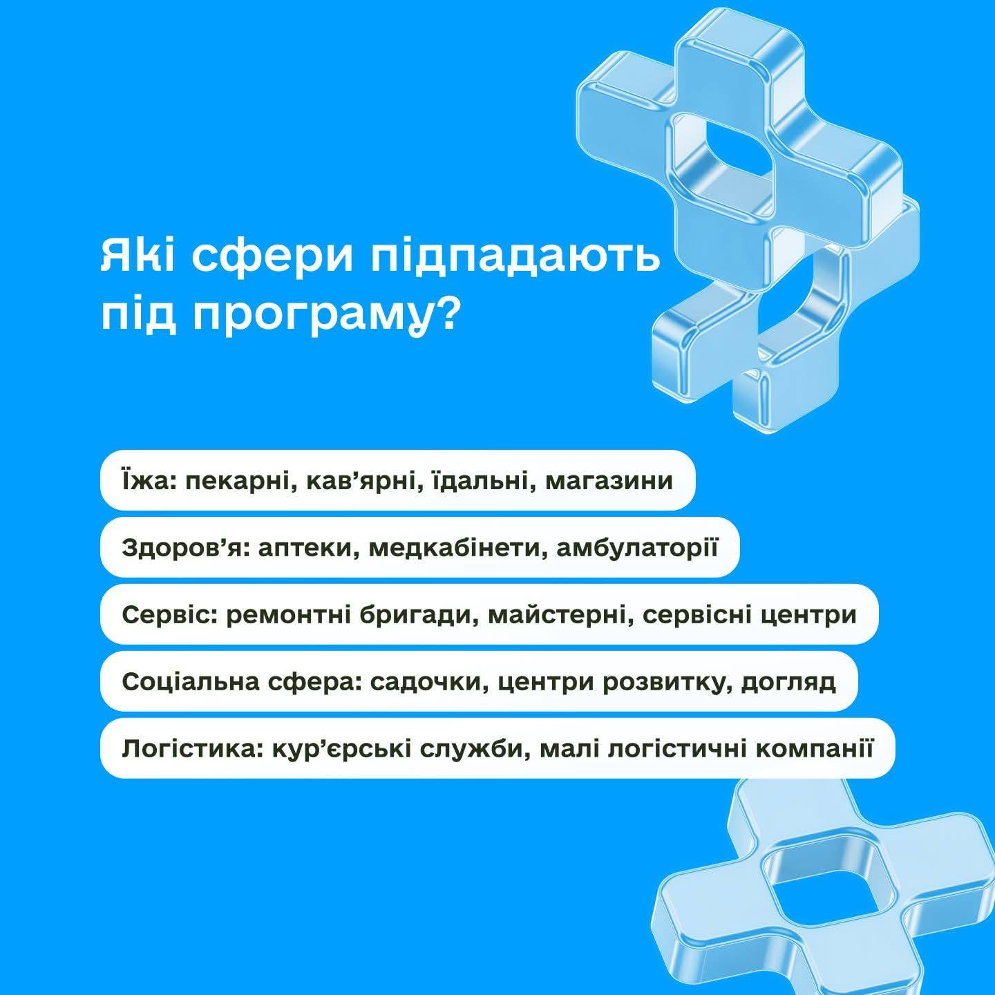 – Їжа: пекарні, кав’ярні, їдальні, малі виробництва, продуктові крамниці;