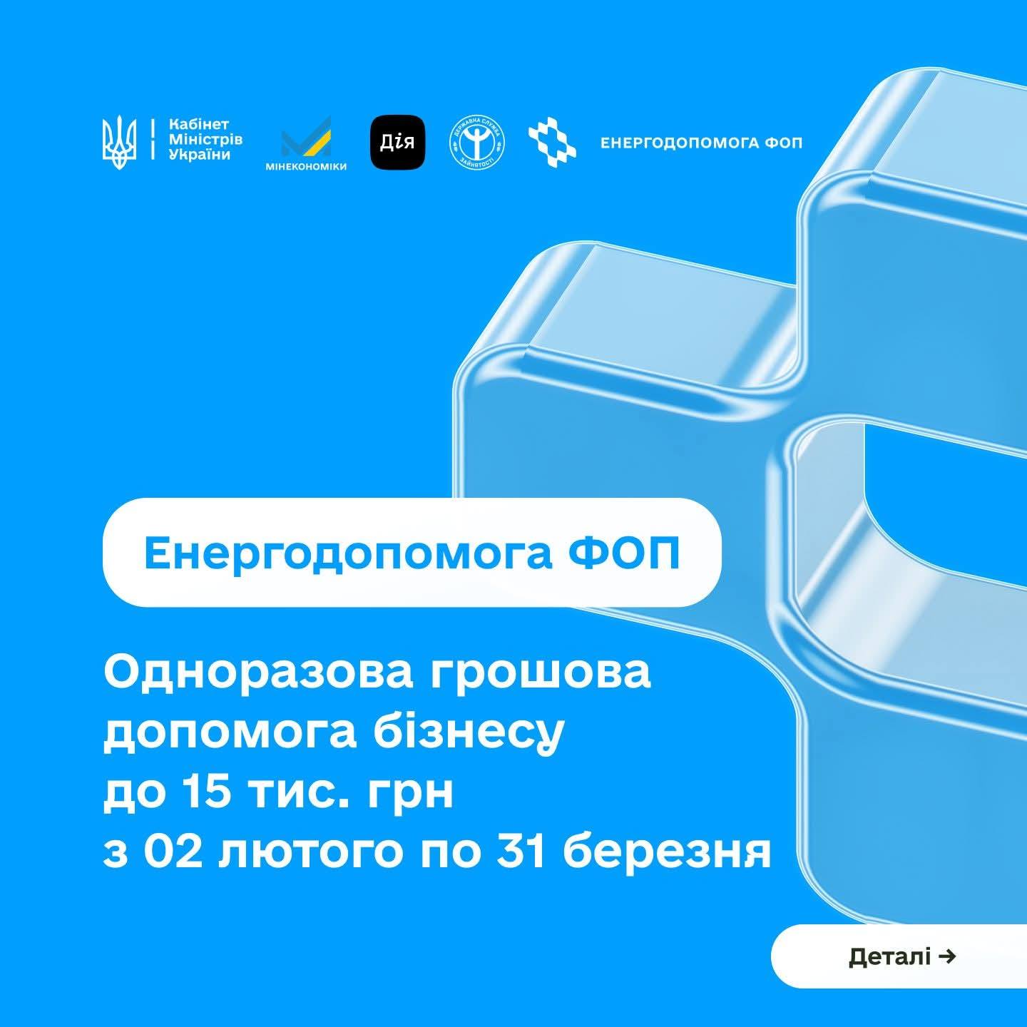 Щоб допомогти українським підприємцям пережити зиму в умовах постійних обстрілів та аварійних відключень, Уряд запровадив спеціальну програму підтримки, яку буде реалізовувати Міністерство економіки, довкілля та сільського господарства України та Державна служба зайнятості. Програма «Енергопідтримка для ФОП» стартує 2 лютого і буде діяти впродовж лютого-березня 2026 року та спрямована на зменшення ризиків простоїв і втрат для підприємств під час відключень електроенергії, збереження робочих місць та стабільну роботу сервісів і виробництва в громадах.