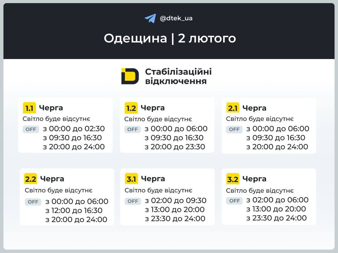 ‼️ Завтра, 2 лютого, відповідно до команди Укренерго діятимуть стабілізаційні відключення в Одеської області.
