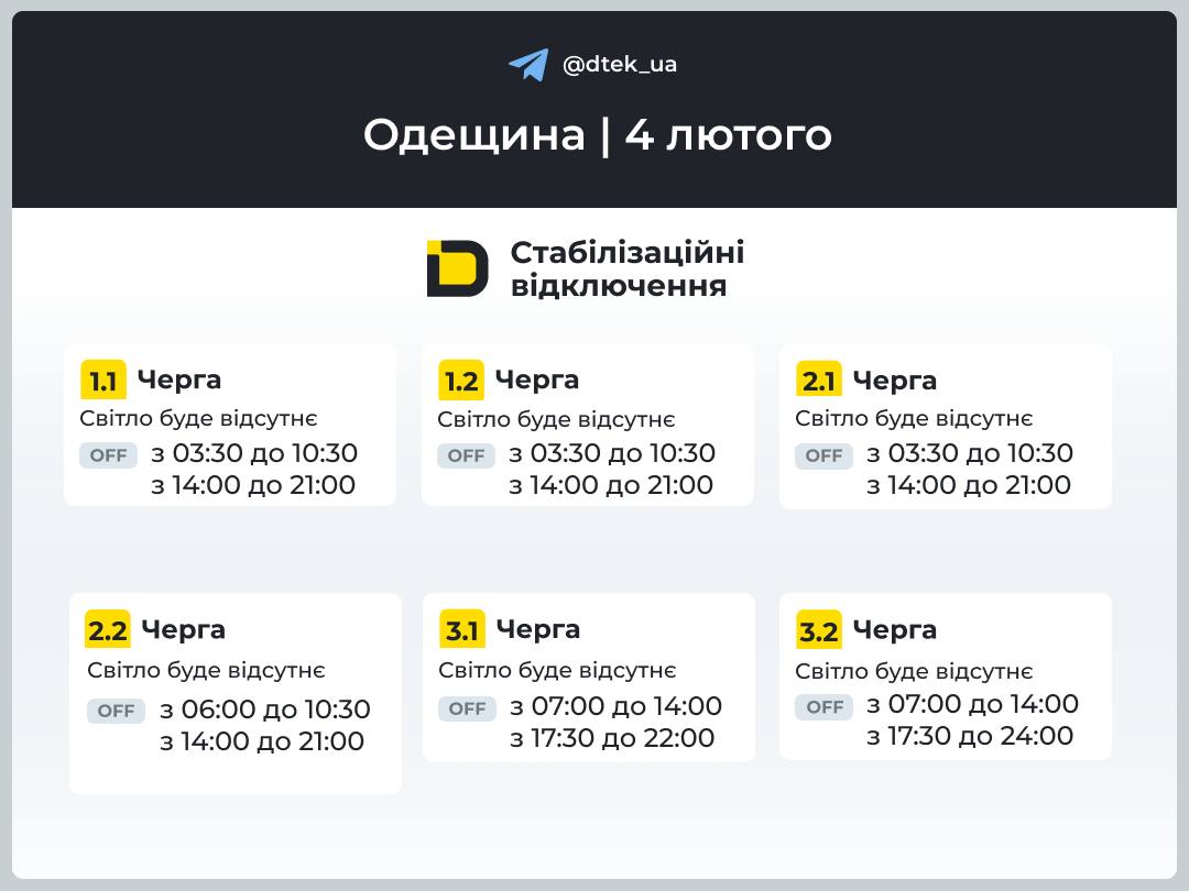 Завтра, 4 лютого, відповідно до команди Укренерго діятимуть стабілізаційні відкл…