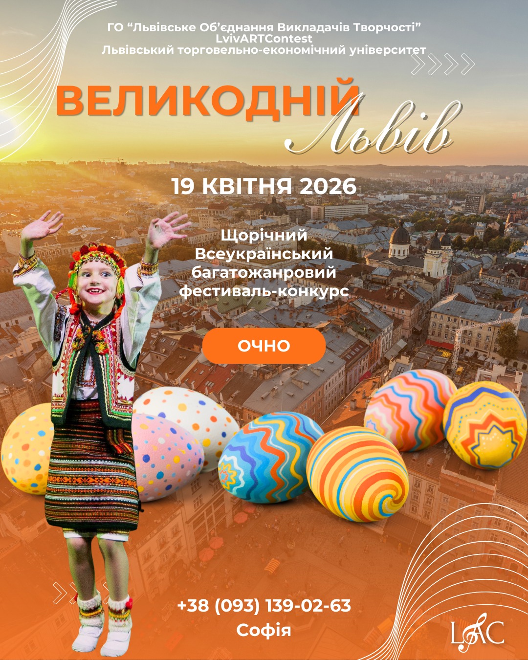 Запрошуємо до участі у Всеукраїнських багатожанрових фестивалях-конкурсах Весняний Львів 2026» (8 березня) та Великодній Львів 2026» (19 квітня), які відбудуться у Львові в очному форматі.