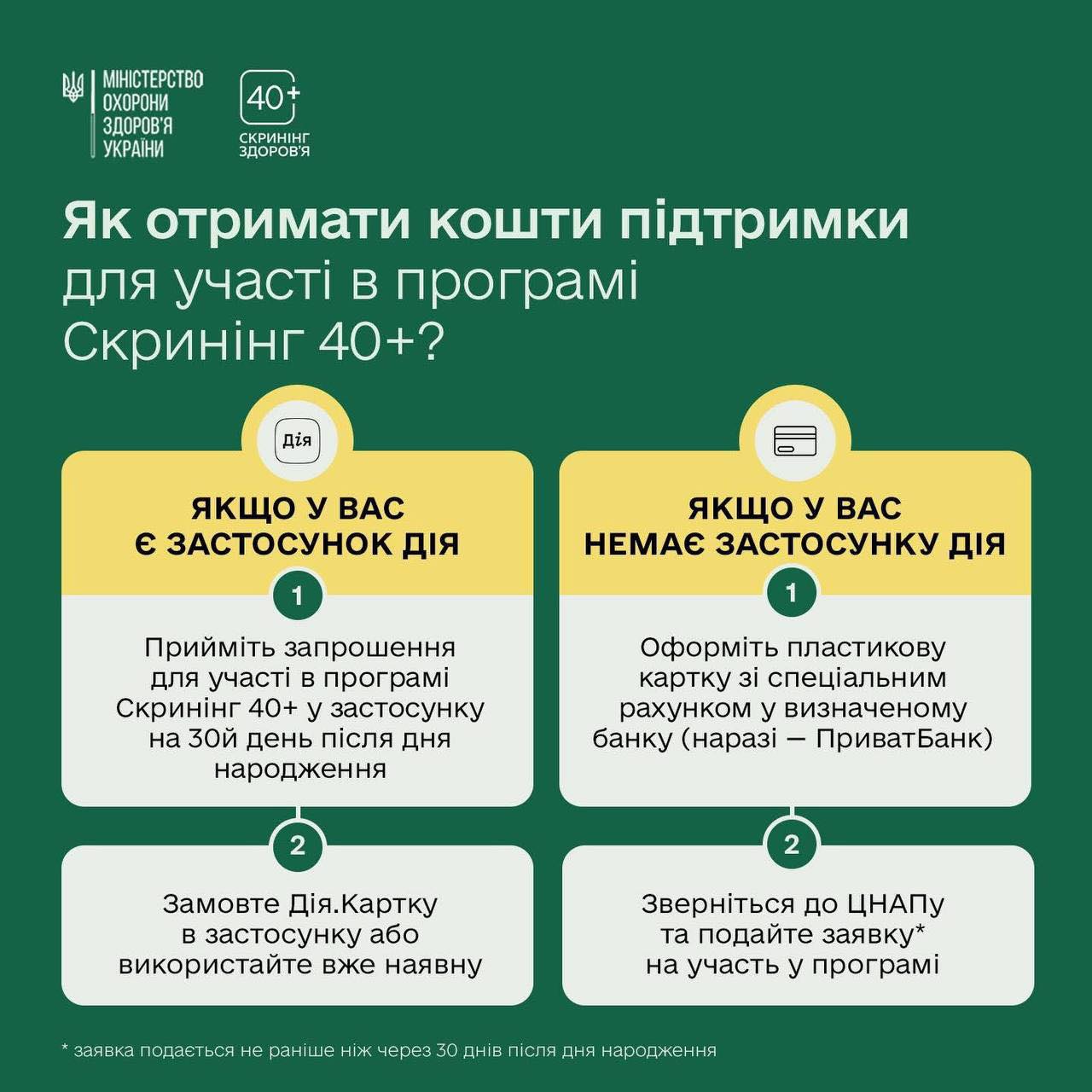 ℹ️Скринінг здоров’я 40+ — це національна програма для українців та українок від 40 років. Вона передбачає базові обстеження для раннього виявлення хвороб і щорічну перевірку серця, рівня цукру та ментального здоров’я. Скринінг безоплатний: після подання заявки держава надає 2000 гривень на обстеження.