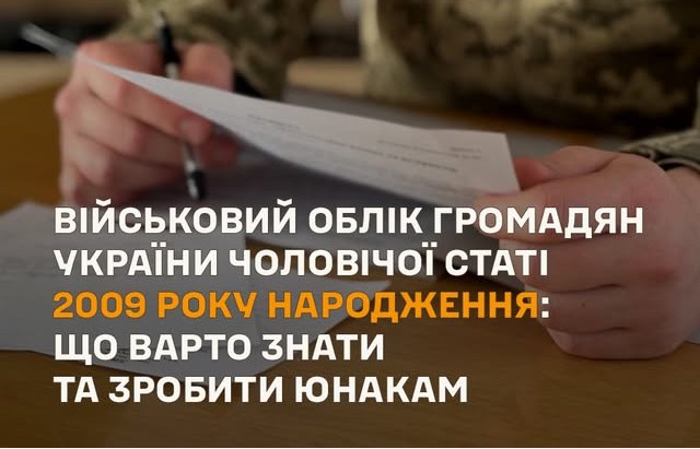 З 29.01.2026 року запрацювала функція взяття на військовий облік юнаків 2009 року народження через додаток “РЕЗЕРВ +”. Громадянам України 2009 року потрібно самостійно пройти електронну ідентифікацію та уточнити свої персональні дані засобами електронного кабінету призовника (РЕЗЕРВ+) та стати на військовий облік призовників до 31 липня 2026 року.