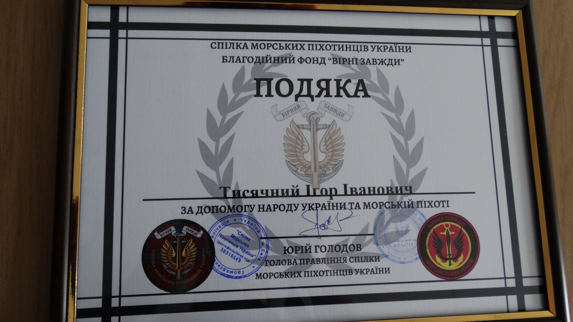 ПОДЯКА ГОЛОВІ ГРОМАДИ ВІД СПІЛКИ МОРСЬКИХ ПІХОТИНЦІВ УКРАЇНИ