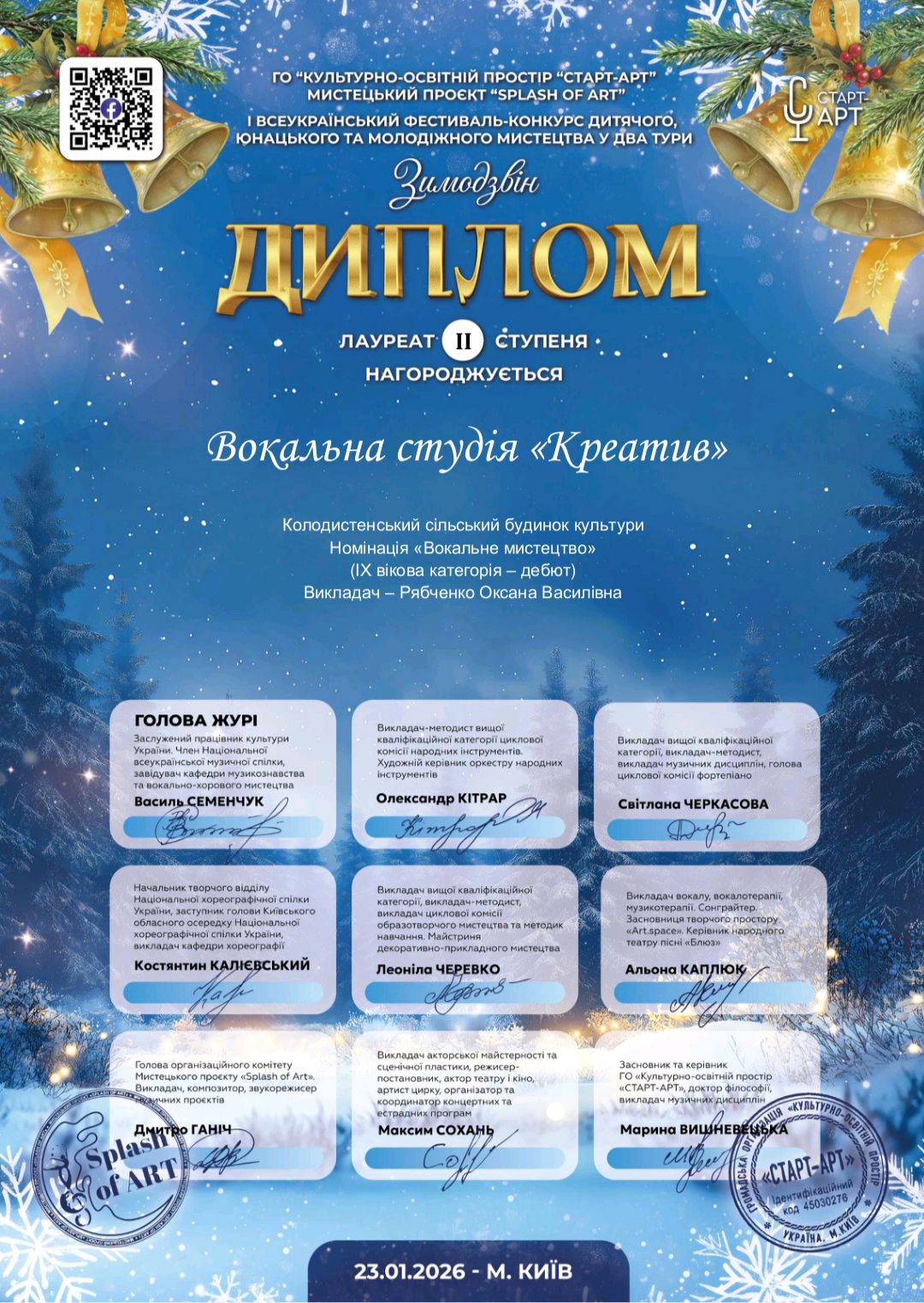 Вокальна студія «Креатив» (с.Колодисте) стала лауреатом ІІ ступеня у номінації «Вокальне мистецтво» (IX вікова категорія — дебют). Викладач — Рябченко Оксана Василівна.