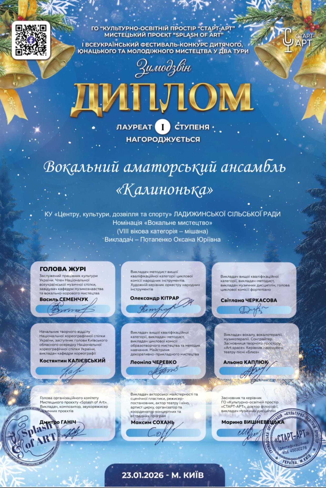 Гордість Ладижинської громади — наші вокальні колективи здобули високі нагороди на Всеукраїнському фестивалі-конкурсі «Зимодзвін» в рамках мистецького проєкту «Splash of Art»!