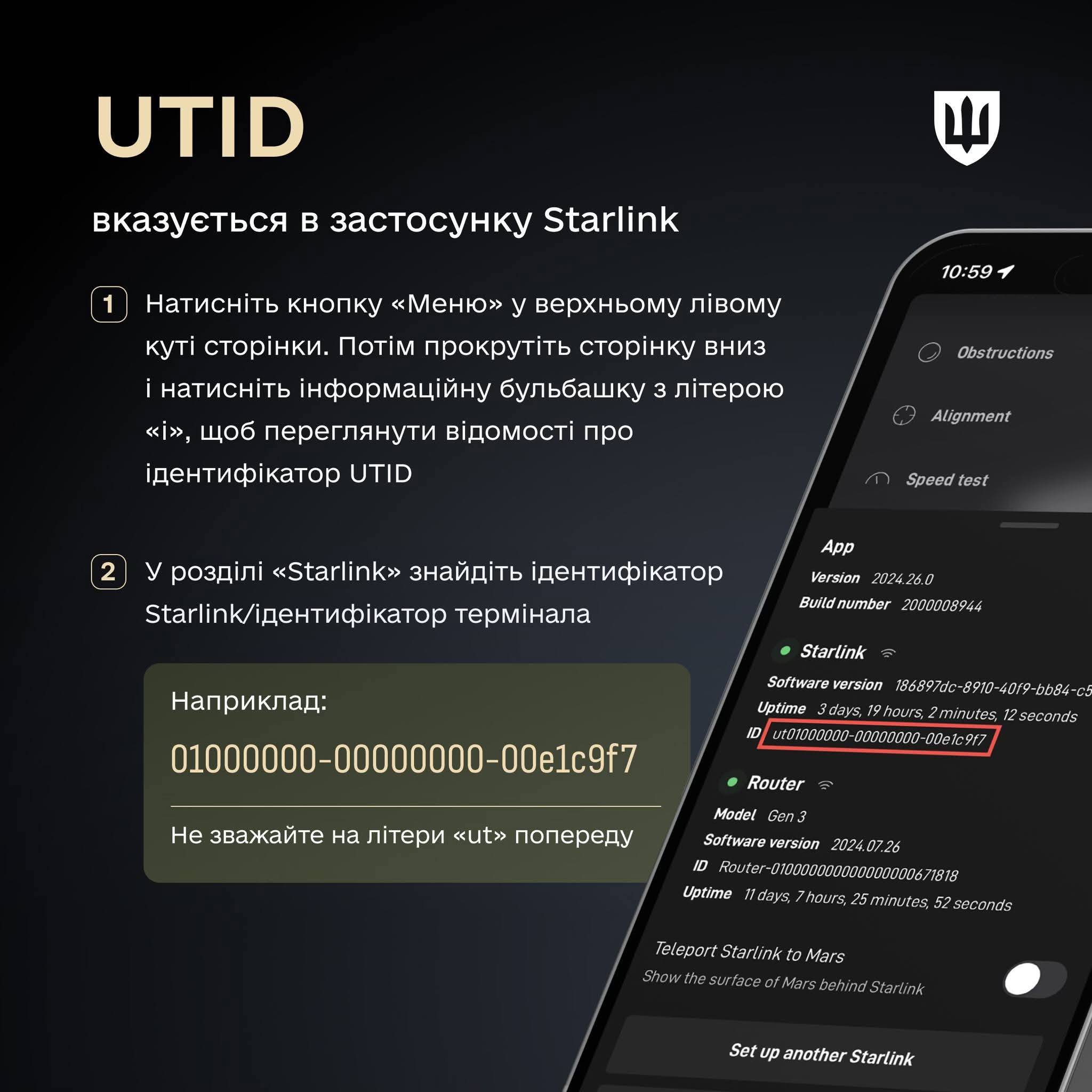 UTID — у налаштуваннях акаунту чи застосунку або Dish ID