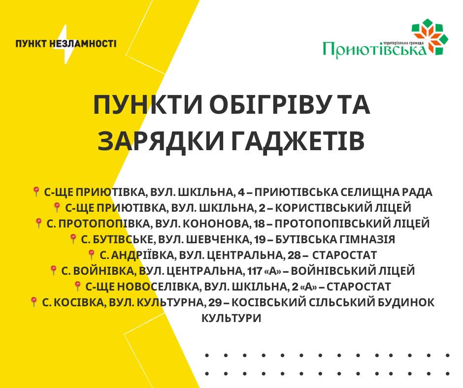 ⚡️ Пункти незламності у Приютівській громаді: адреси та режим роботи