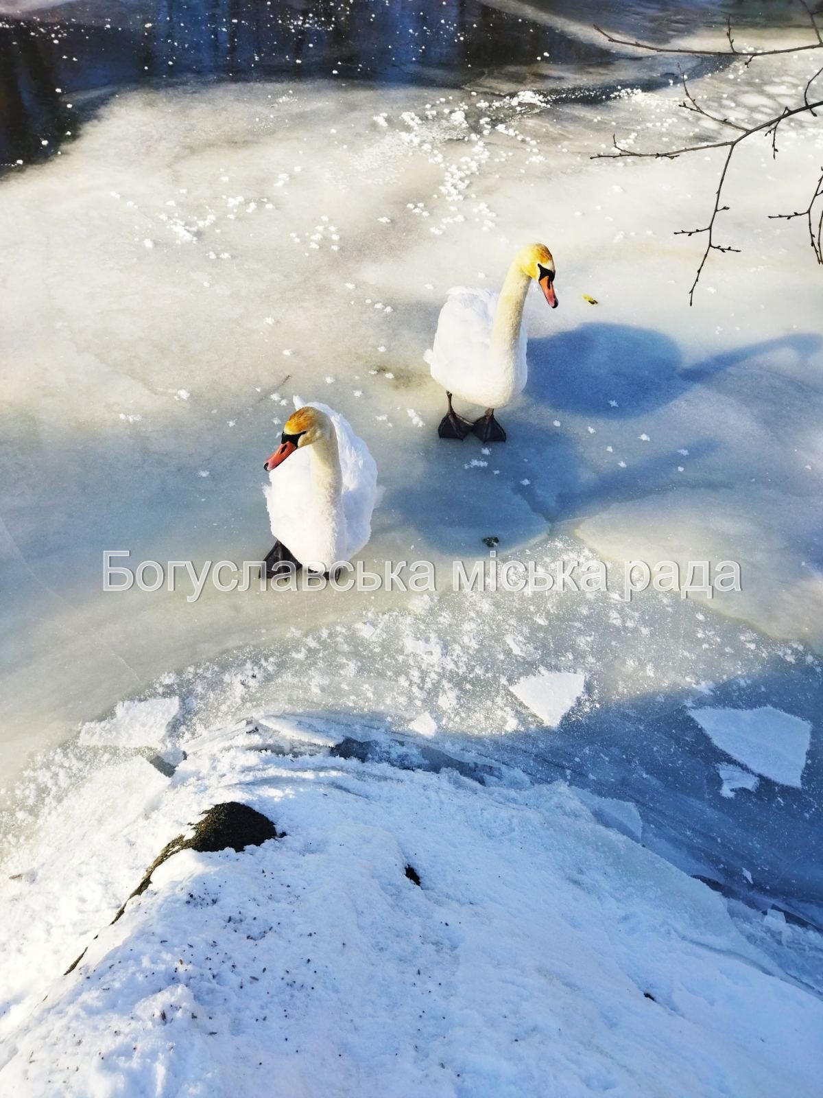 Представники Богуславської міської ради звернулись по допомогу до спеціалістів Богуславської державної дільничної лікарні ветеринарної медицини, які під час огляду лебедів зазначили, що ті страждають від нестачі їжі.