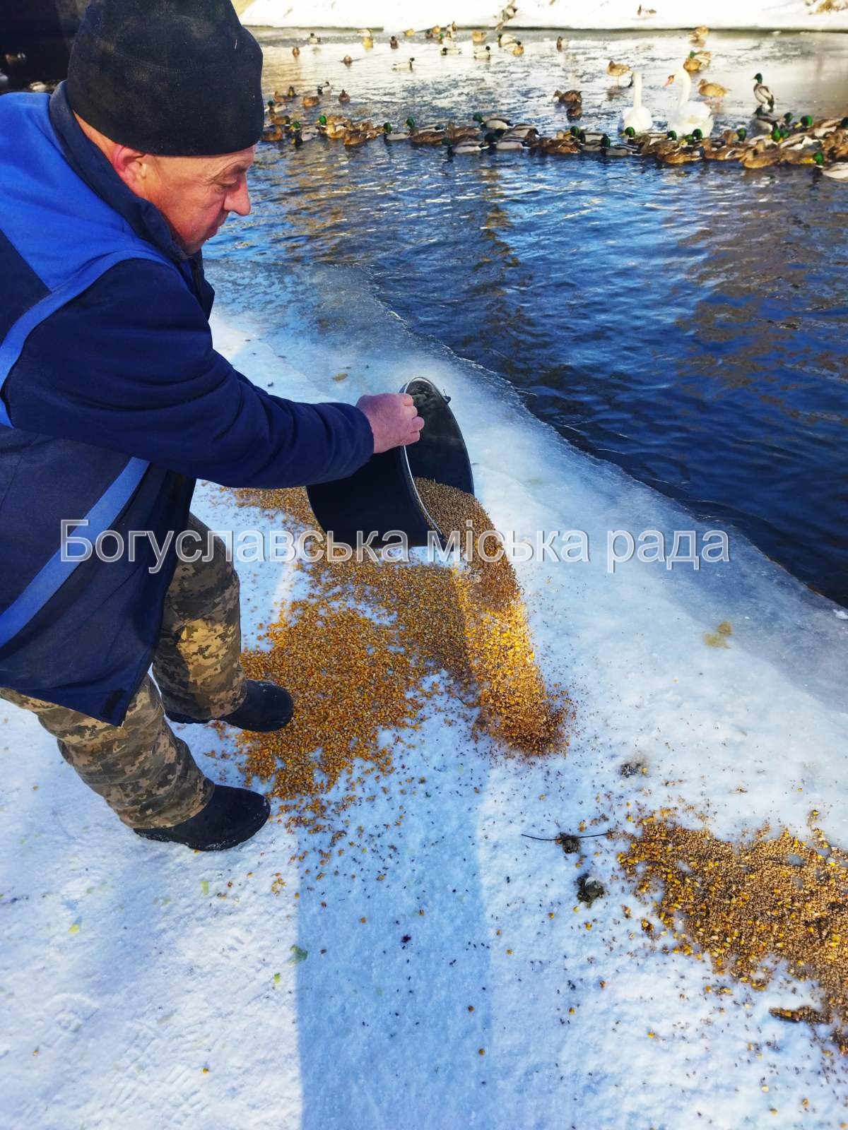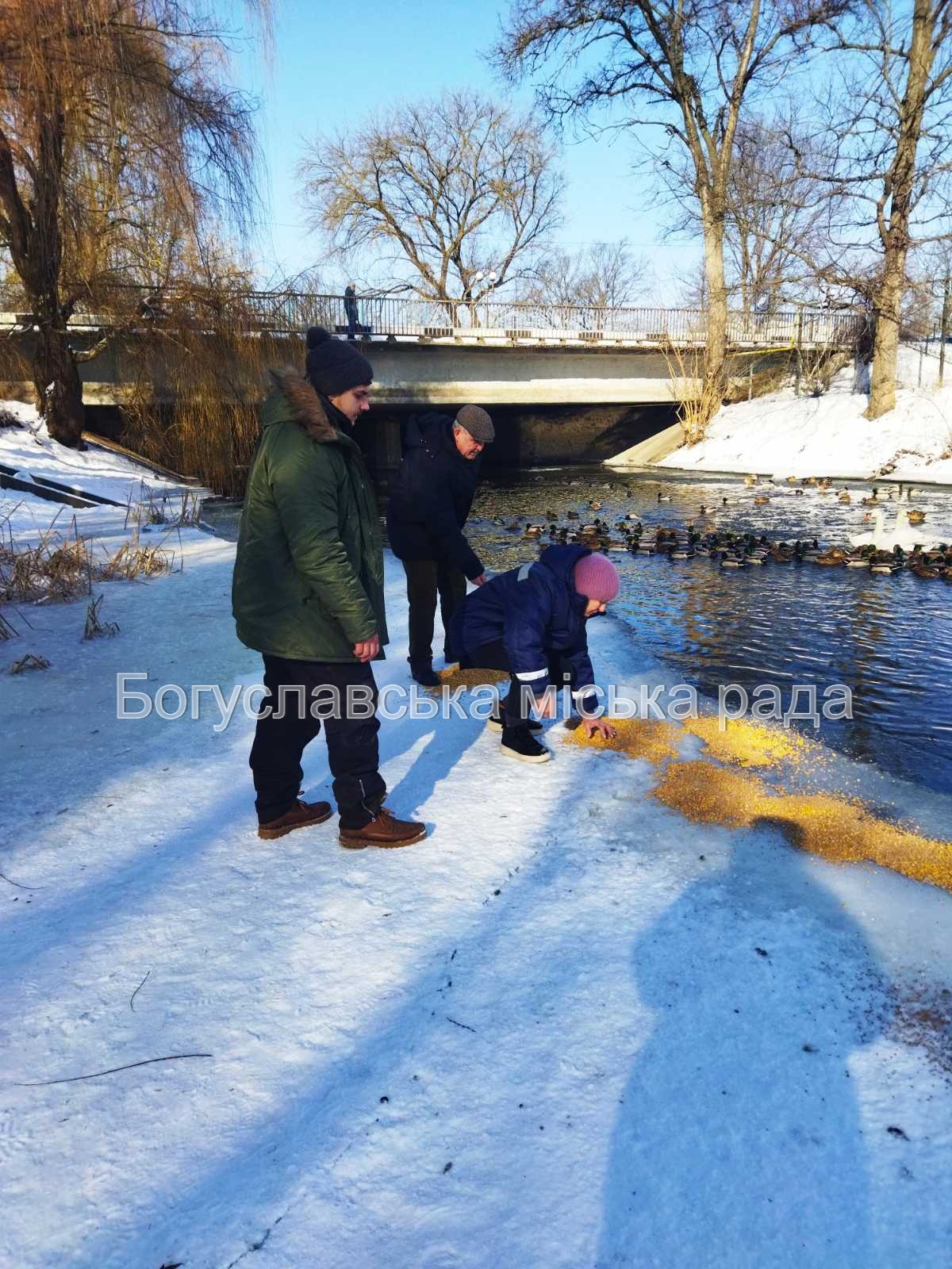 Навіть сильні морози не примусили красенів-лебедів та різнобарвних качок залишити наш Богуслав. Вони величаво плавають посеред криги в річці Росі, шукаючи їжу.