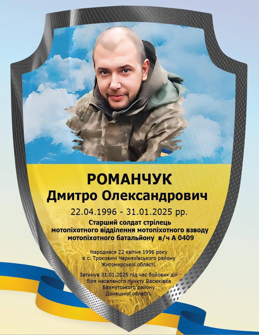 Старший солдат-стрілець мотопіхотного відділення мотопіхотного взводу мотопіхотного батальйону в/ч А 0409 Дмитро Романчук поклав своє життя 31 січня 2025 року під час виконання бойового завдання поблизу населеного пункту Васюківка Бахмутського району Донецької області, до останнього подиху мужньо та відважно боровшись за наш спокій.