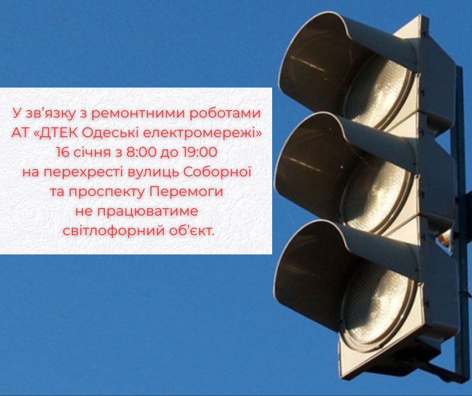 У зв’язку з ремонтними роботами АТ «ДТЕК Одеські електромережі» світлофор на перехресті вулиць Соборна та проспект Перемоги не працюватиме 16 січня з 8:00 до 19:00.