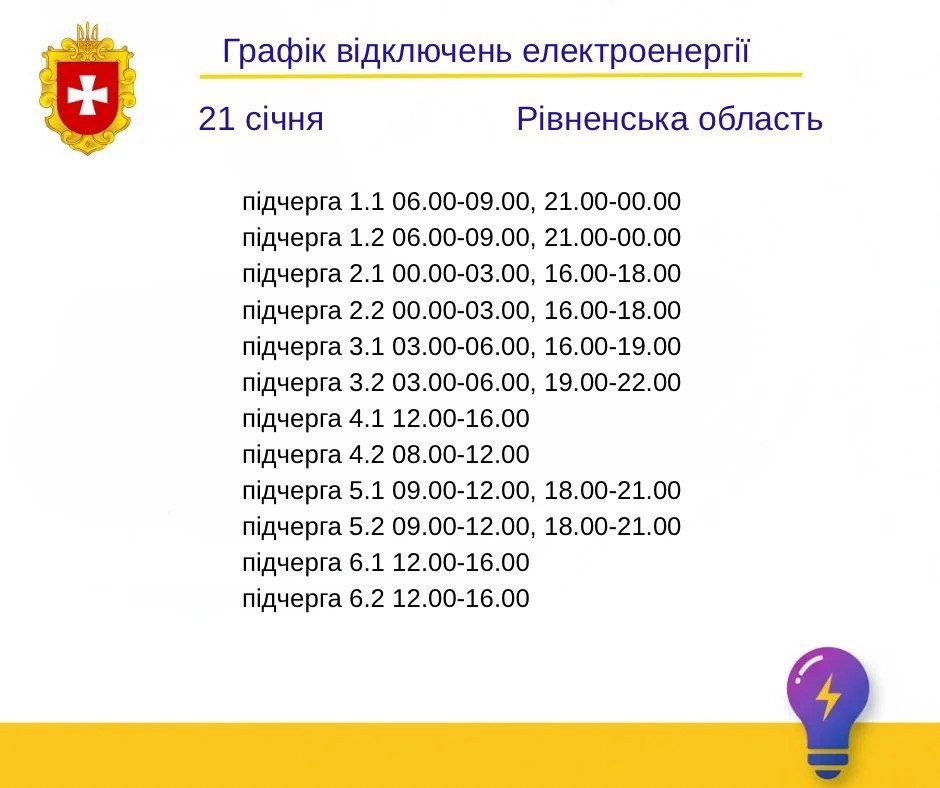 ⚡️ У зв’язку зі складною ситуацією в енергосистемі держави Укренерго дало команду запровадити на Рівненщині у середу, 21 січня, графік погодинних відключень електроенергії: