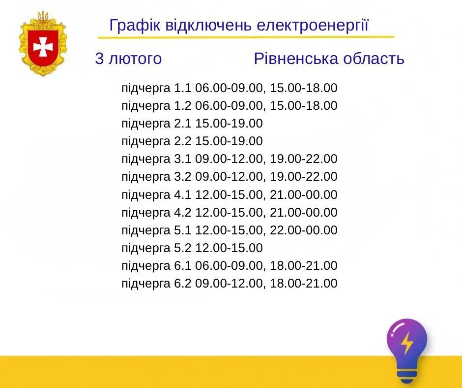 ⚡️ У зв’язку зі складною ситуацією в енергосистемі держави Укренерго дало команду запровадити на Рівненщині у вівторок, 3 лютого, графік погодинних відключень електроенергії: