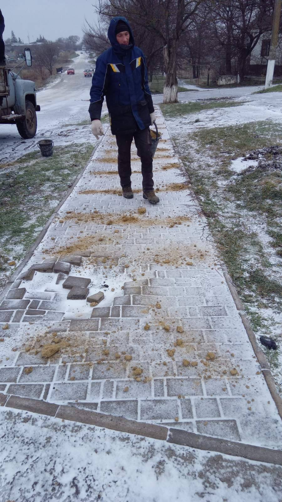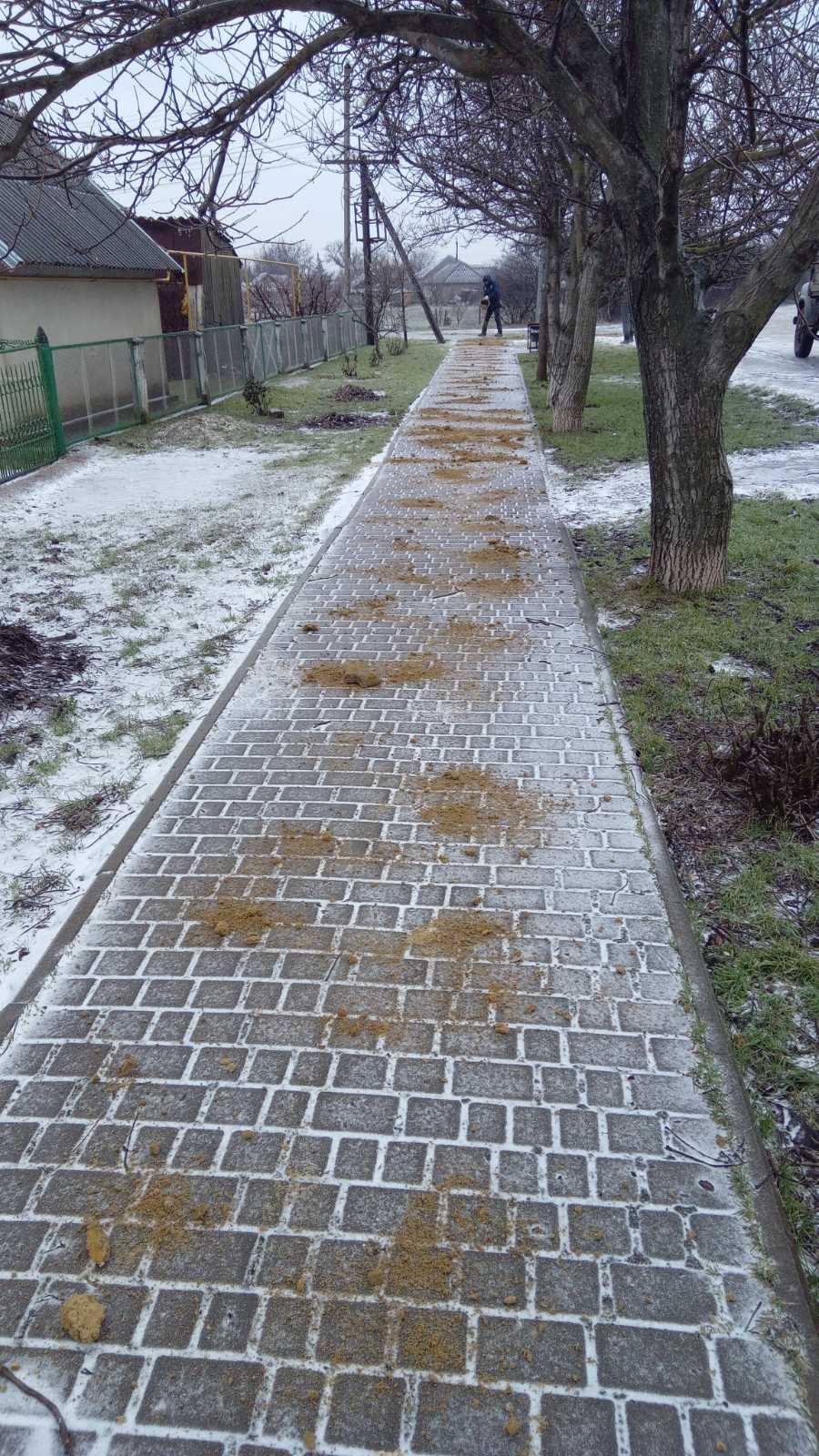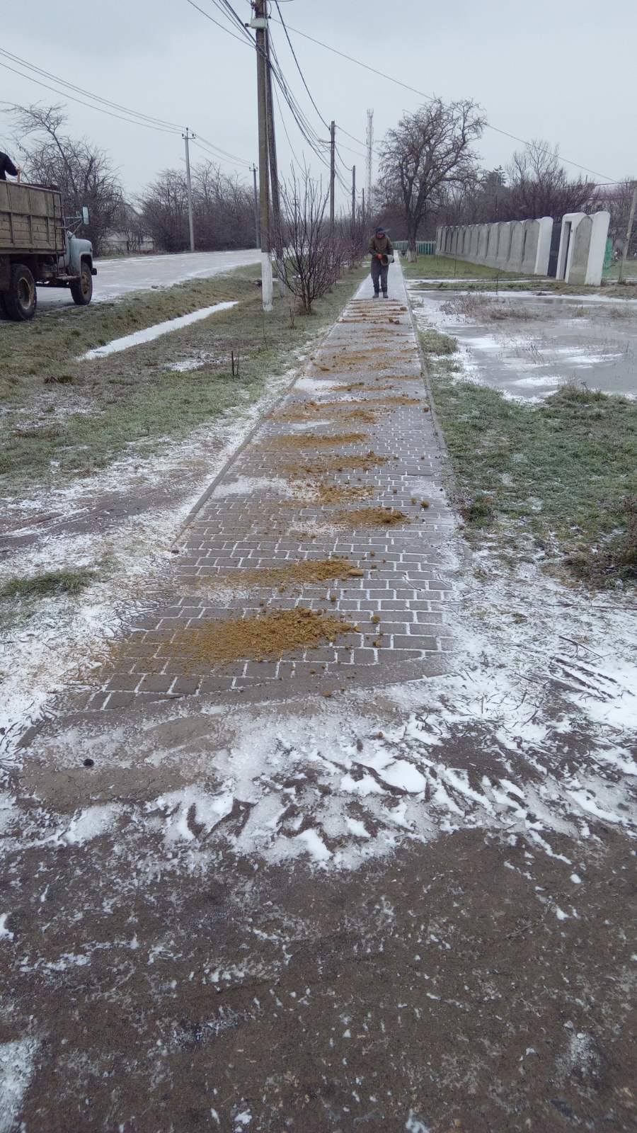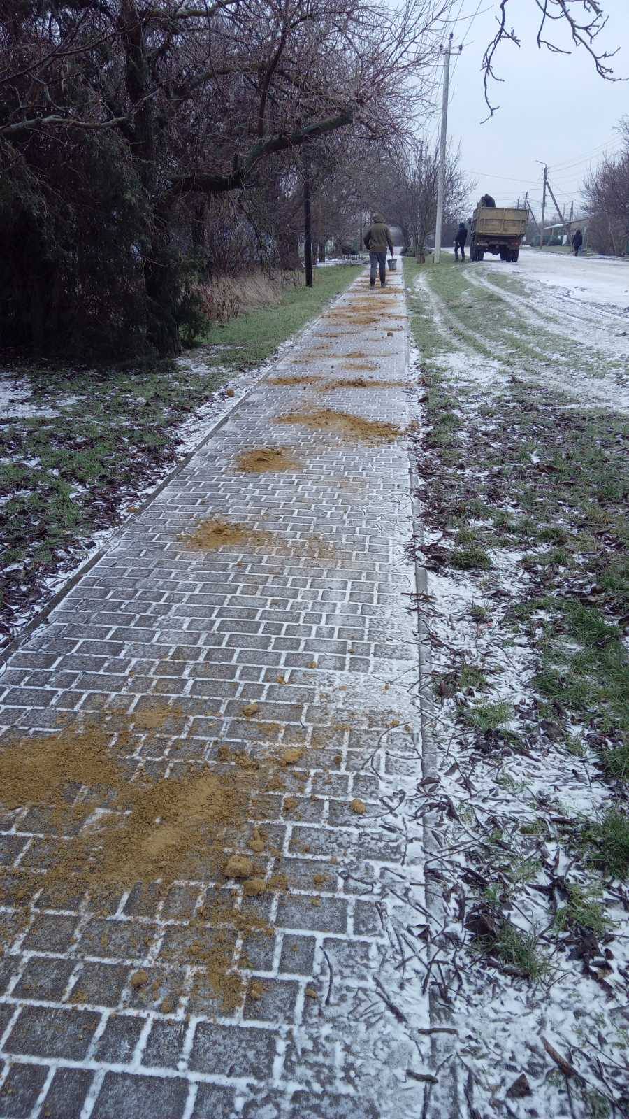 У складних погодних умовах працівники благоустрою в селі Курісове та в селі Каїри здійснюють посипання піском автомобільних доріг та тротуарів з метою запобігання ожеледиці та забезпечення безпеки учасників дорожнього руху.