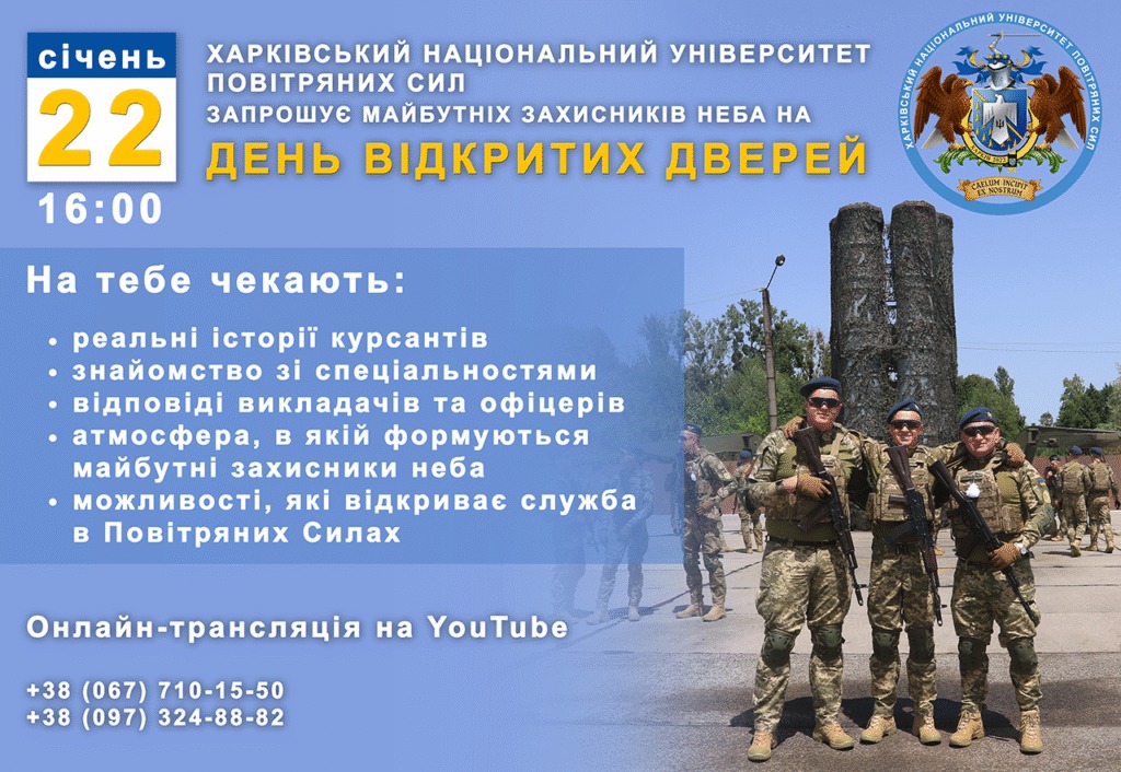 – 22 січня 2026 року – День відкритих дверей у Харківському національному університеті Повітряних Сил імені Івана Кожедуба. Подробиці за посиланням: https://hups.mil.gov.ua/den-vidkritix-dverej/