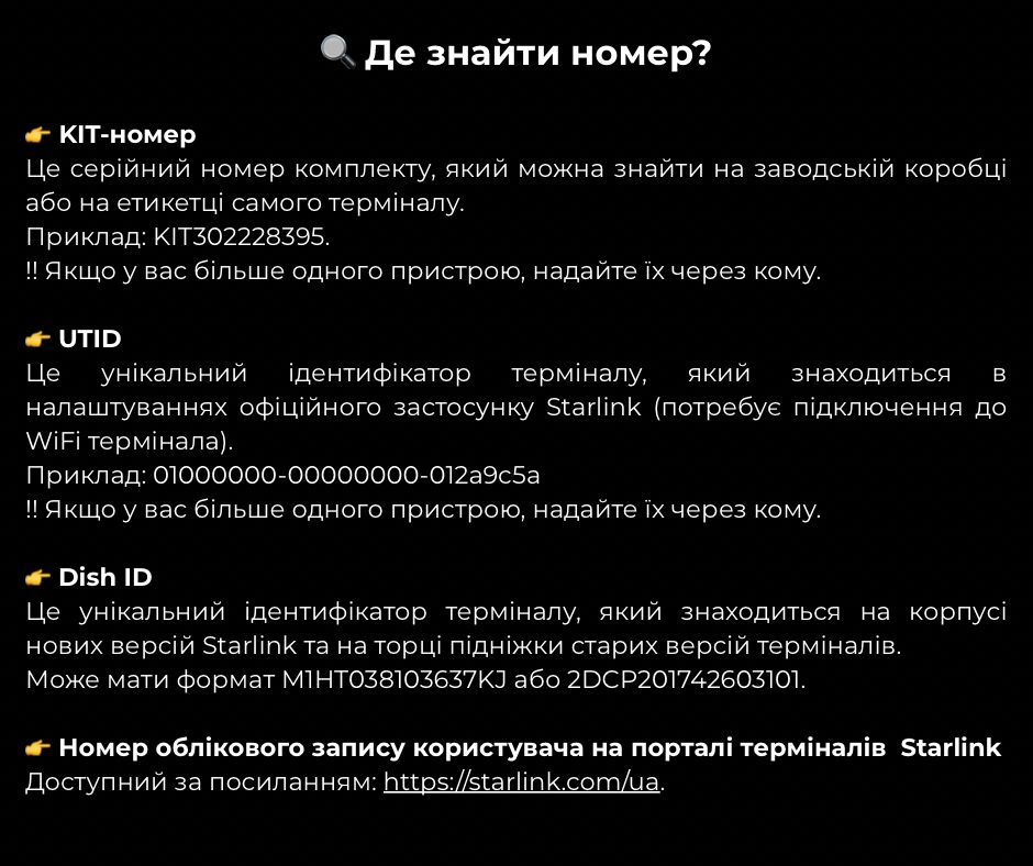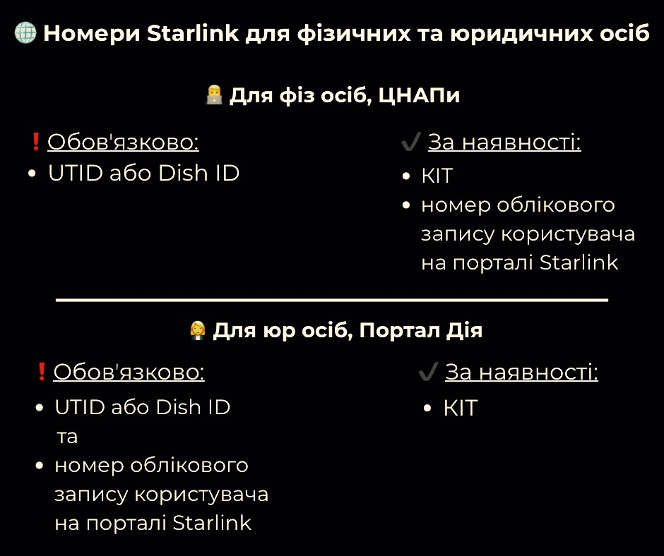– номер облікового запису користувача на порталі Starlink (за наявності).