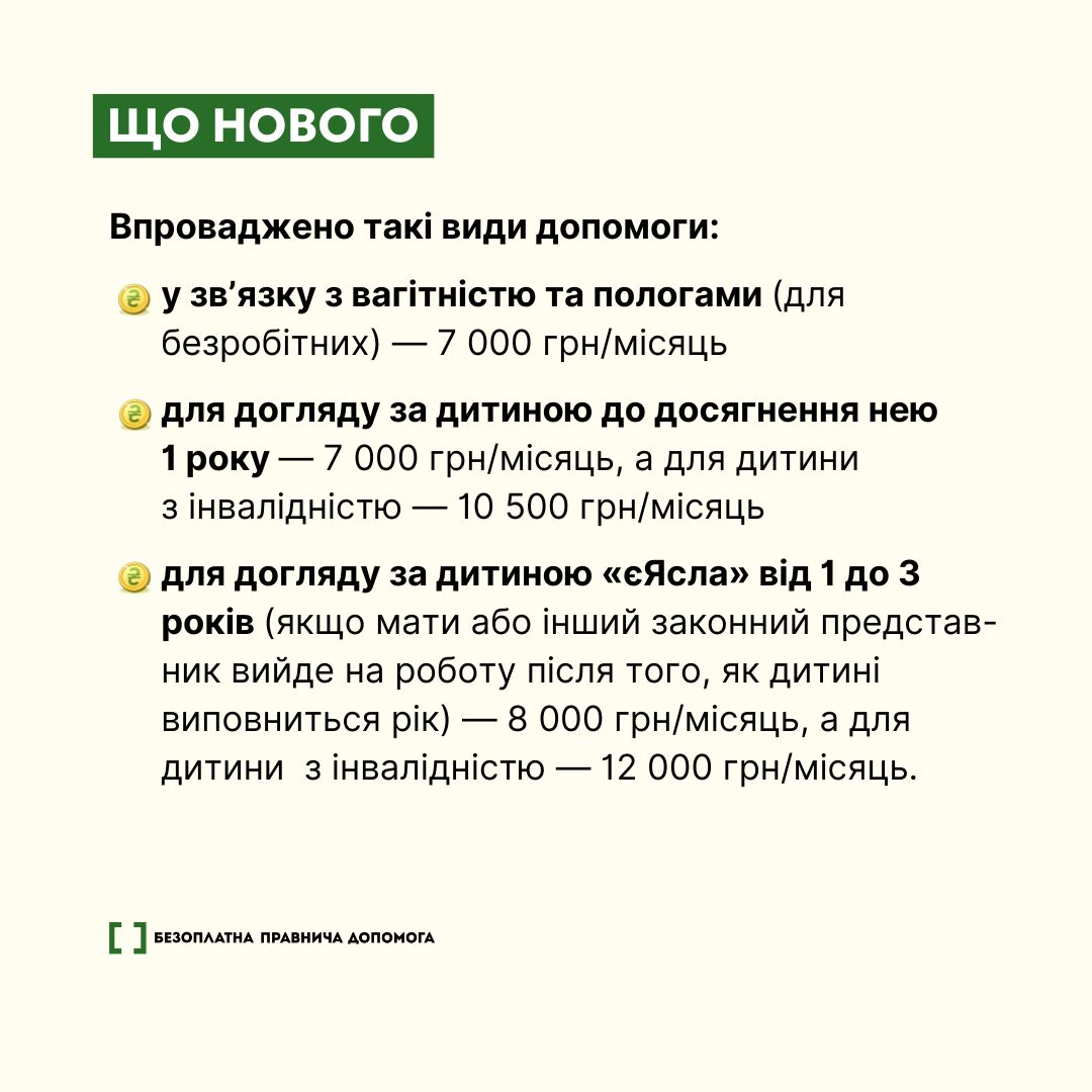 🟩 Цьогоріч змінилася сума допомоги при народженні дитини. Окрім того, запроваджуються нові види державної допомоги сім’ям з дітьми та продовжують діяти вже відомі виплати на дитину. Оформити їх може один із батьків дитини або опікун, з яким дитина постійно проживає.