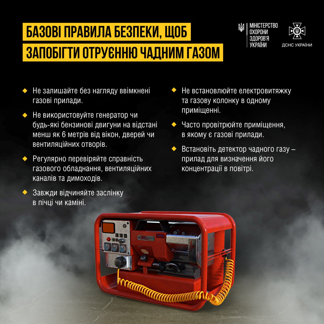 ⚠️ Не використовуйте для обігріву кімнат газові плити й духовки. Генератори та будь-які бензинові двигуни використовуйте поза приміщеннями, на відстані не менш як 6 метрів від вікон, дверей або вентиляційних отворів.