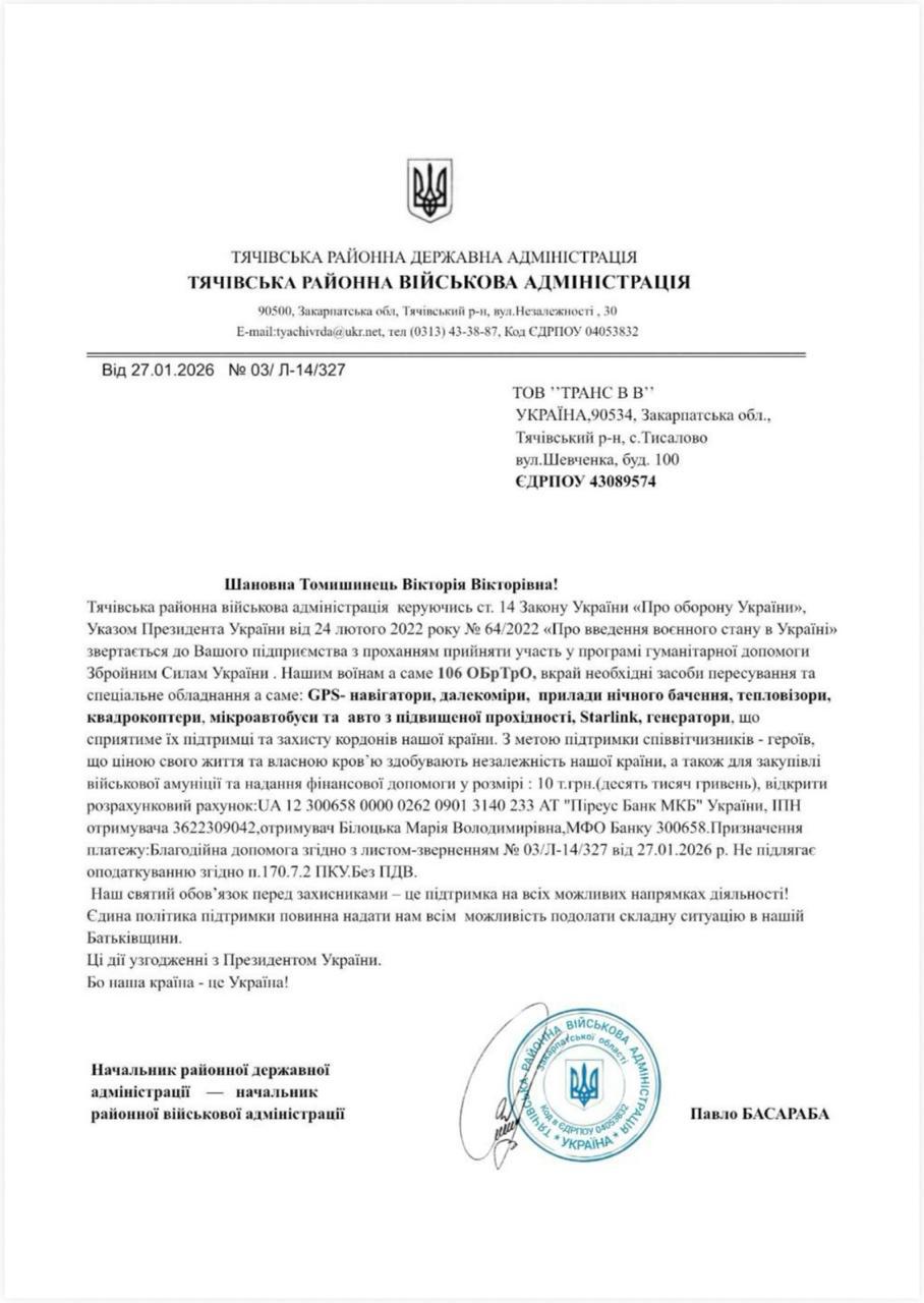 Тячівська районна державна адміністрація не здійснює збір коштів у телефонному режимі, через месенджери чи приватні повідомлення, а також не уповноважувала жодних осіб звертатися з подібними проханнями.