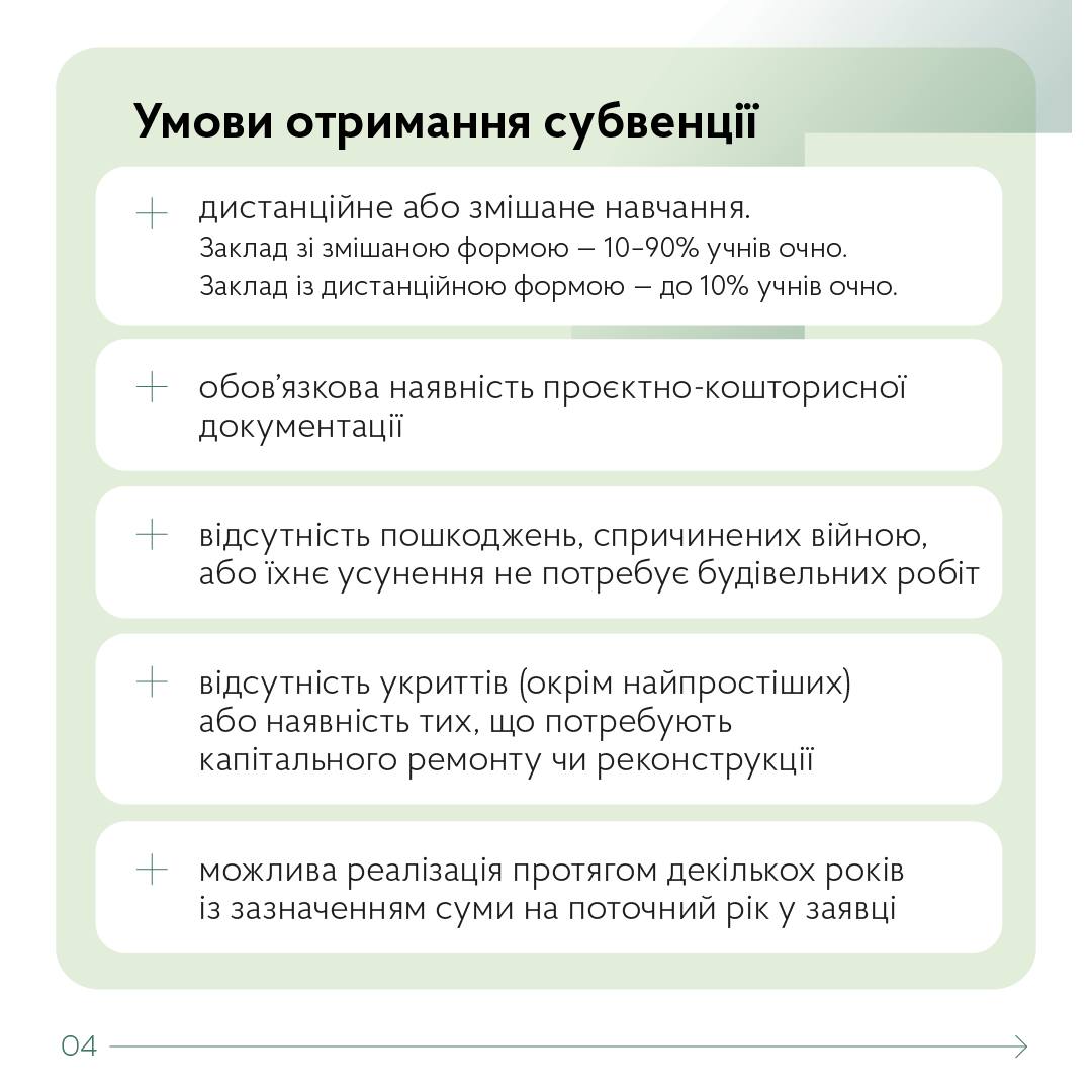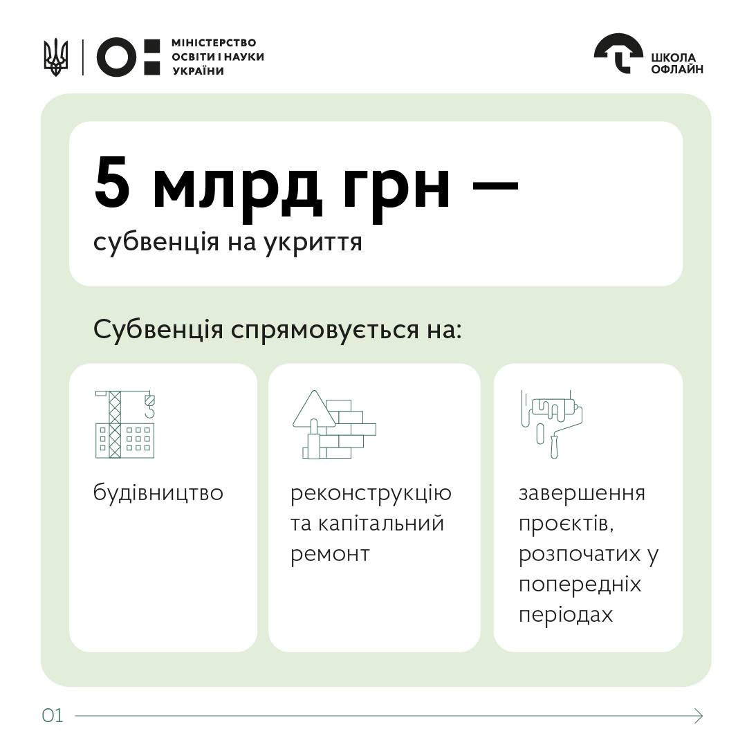 Від сьогодні стартує прийом заявок на фінансування укриттів у закладах освіти. Цього року на це спрямовано 5 млрд грн.