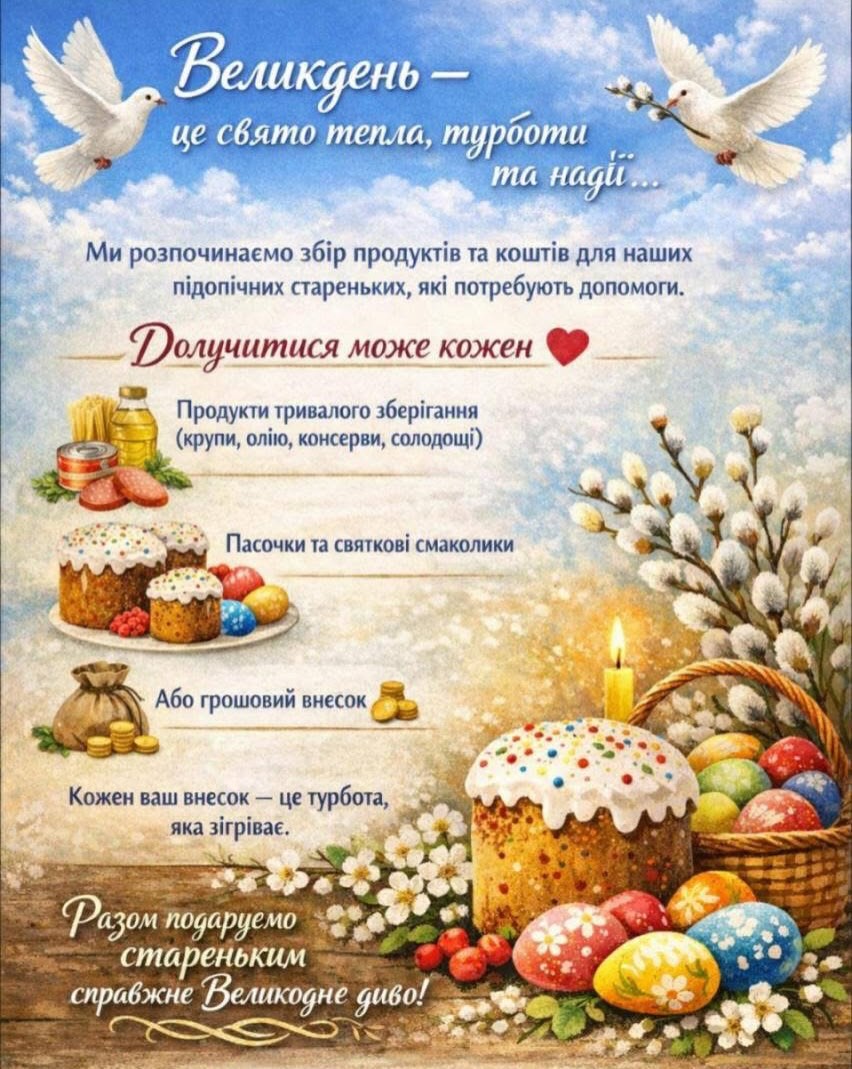 Великдень — це свято, яке символізує тепло, турботу та оновлення надії. 🕊️ У ці особливі дні прагнення дарувати увагу й підтримку кожній людині стає ще сильнішим. Наша організація розпочинає важливу акцію зі збору продуктів та коштів для підопічних літніх людей, які особливо потребують нашої допомоги. Для багатьох із них, особливо для тих, хто самотній, ваша підтримка — це не просто допомога, а справжня можливість відчути атмосферу свята, тепло людських сердець і переконатися, що вони не залишені наодинці зі своїми проблемами. Долучитися до цієї шляхетної справи може кожен бажаючий ❤️. Ви можете зробити свій внесок, передавши: