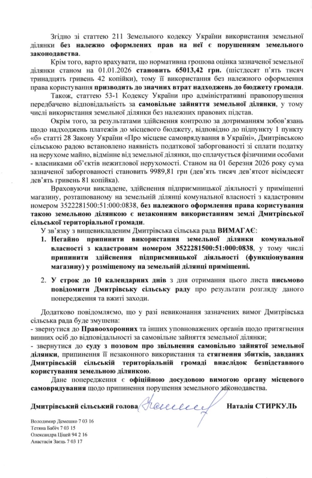Для повного розуміння ситуації та прозорості процесу, ми публікуємо повний текст офіційного попередження. Ми прагнемо до відкритого діалогу та співпраці з усіма мешканцями та підприємцями громади.