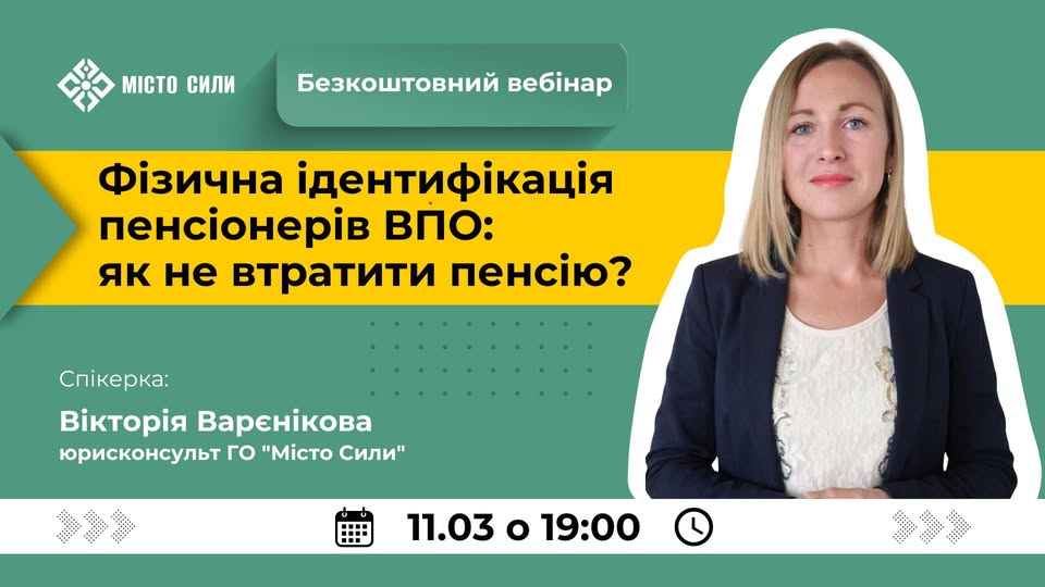 Відкрито реєстрацію на вебінар “Фізична ідентифікація пенсіонерів ВПО: як не втратити пенсію?” 11 березня о 19:00 Громадська організація “Місто Сили” запрошує на безкоштовний вебінар, присвячений актуальній темі “Фізична ідентифікація пенсіонерів ВПО: як не втратити пенсію”. Цей захід є надзвичайно важливим для пенсіонерів, які мають статус внутрішньо переміщених осіб (ВПО) та мешкають у Херсонській, Миколаївській та Одеській областях. Головна мета вебінару – надати вичерпну інформацію щодо процедури фізичної ідентифікації в Пенсійному фонді України, яка є обов’язковою для продовження виплат пенсій. Ми детально розглянемо різні шляхи проходження ідентифікації, зокрема для тих, хто перебуває за кордоном, або не має можливості скористатися смартфоном та додатком “Дія”.