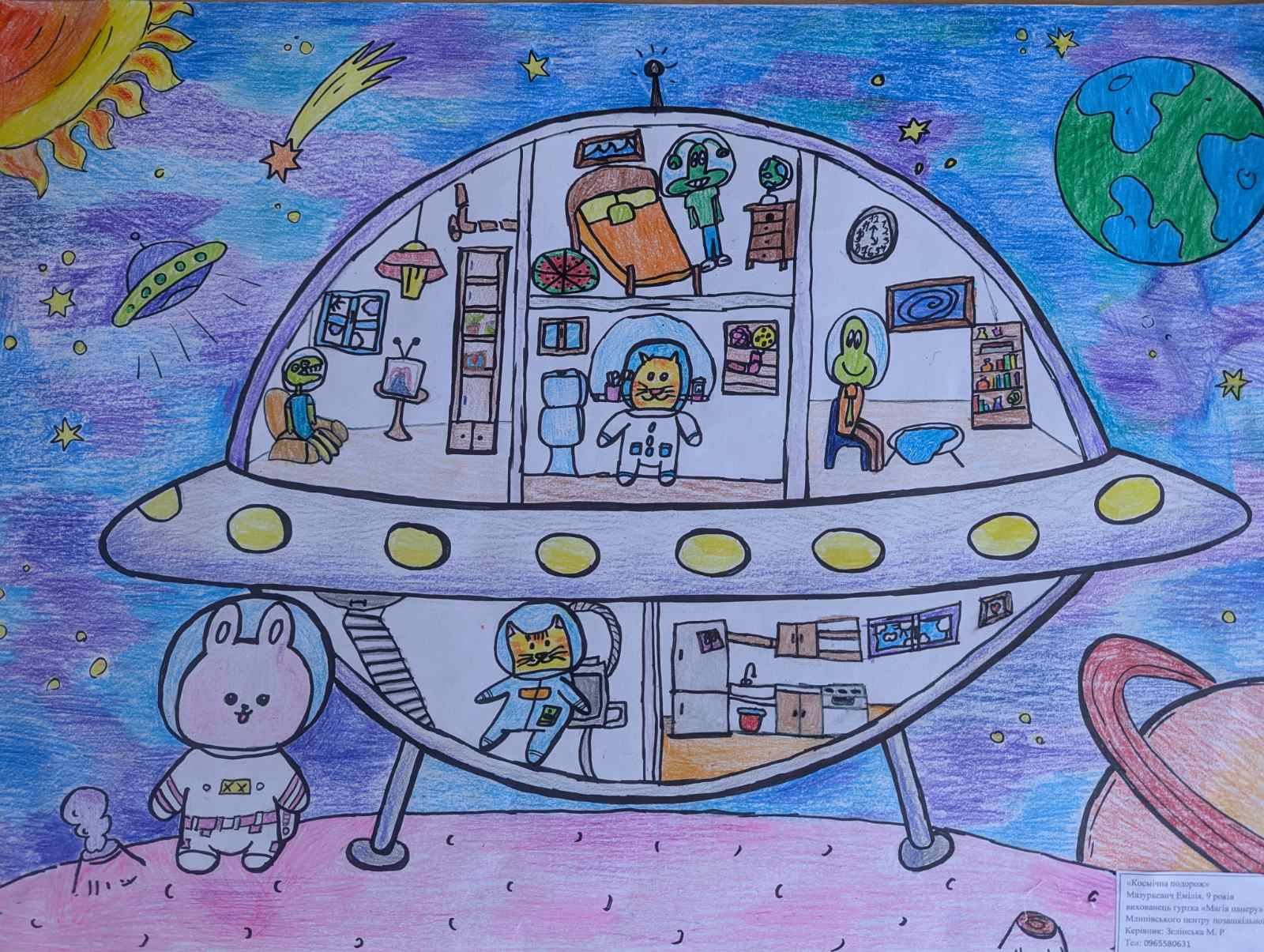 🖌 «Ми в космосі не одні!» — Софія Черв’як (Довгошиївський ліцей, керівник — Надія Ткачук); цікава композиція та несподіваний сюжет.