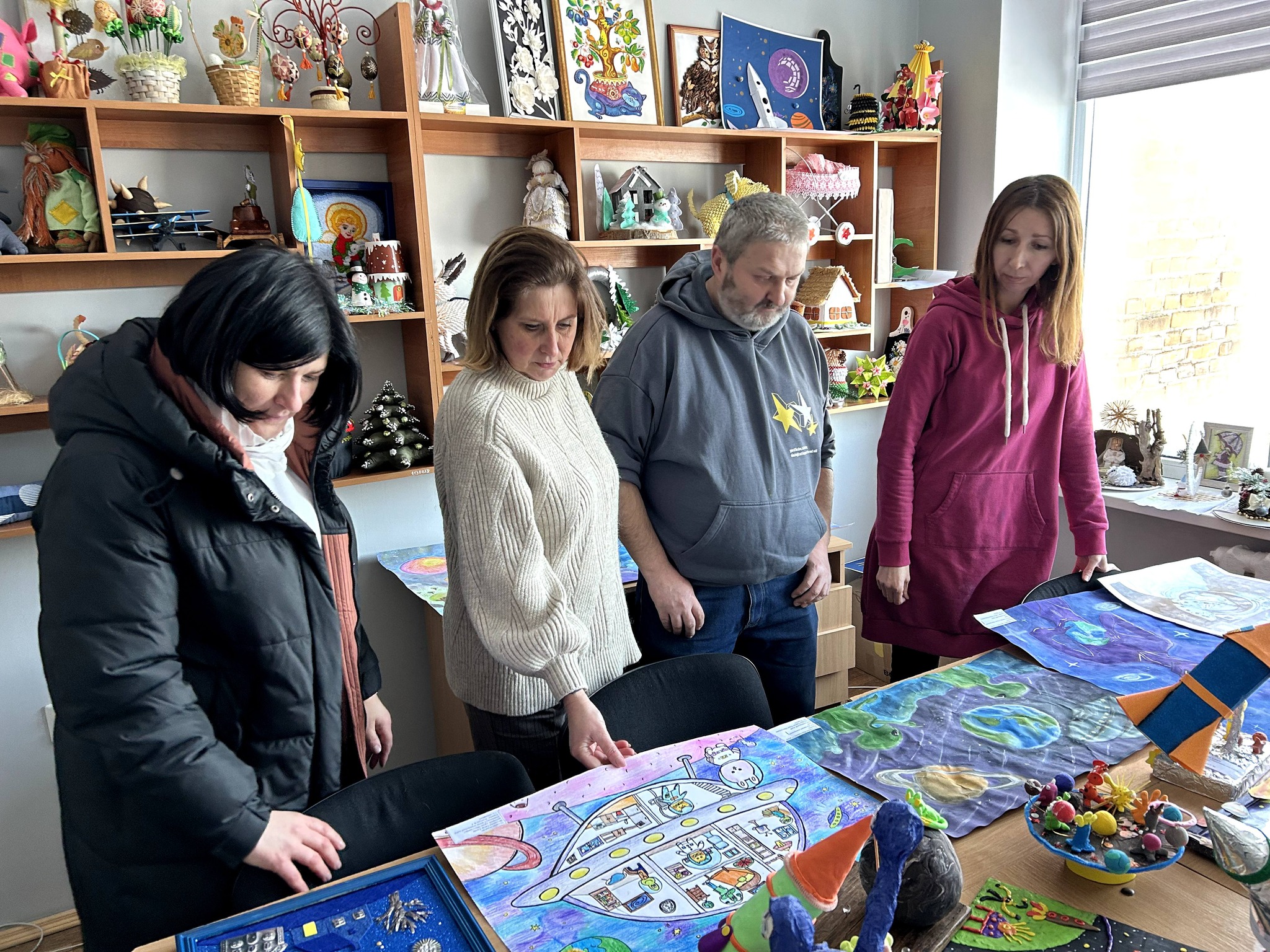 🖍 «Таємниці космічного неба» — колектив гуртка «Арт-майстерня “Кольоровий світ”» (Млинівський ЦПО, керівник — Марія Зелінська); колективна творчість, що демонструє єднання та спільне бачення космічної теми.