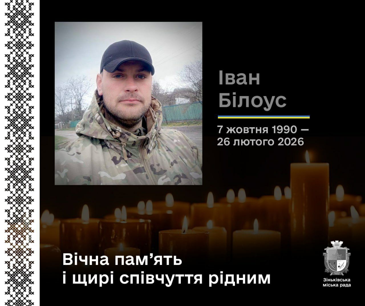 💔Війна продовжує забирати своїх найвідважніших синів. 26 лютого 2026 року на 35-му році життя обірвалося життя Героя, ветерана російсько-української війни – Білоуса Івана Миколайовича, відомого побратимам за позивним “Єнот”.