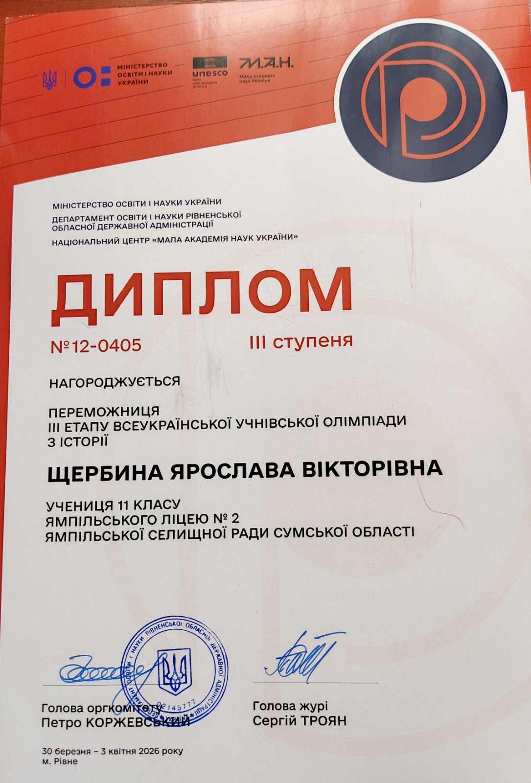 Щербіна Ярослава, учениця 11 класу Ямпільського ліцею № 2 Ямпільської селищної ради, представляла Сумську область на всеукраїнському рівні та виборола почесне ІІІ місце.