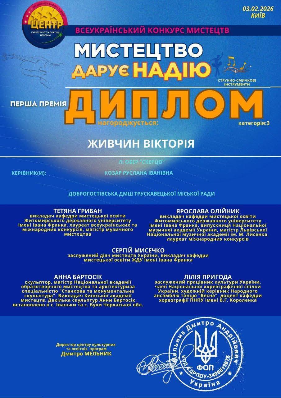 З гордістю вітаємо Живчин Вікторію, талановиту ученицю Доброгостівської дитячої музичної школи, з її блискучим досягненням! Вікторія здобула Диплом Першої Премії на престижному Всеукраїнському конкурсі мистецтв “МИСТЕЦТВО ДАРУЄ НАДІЮ”. Це визнання є свідченням її наполегливої праці, відданості мистецтву та неабиякого таланту.
