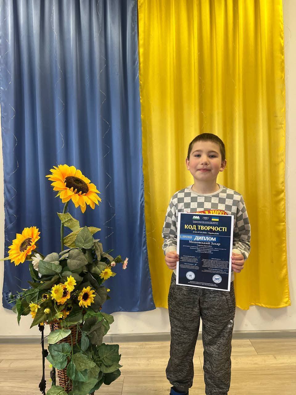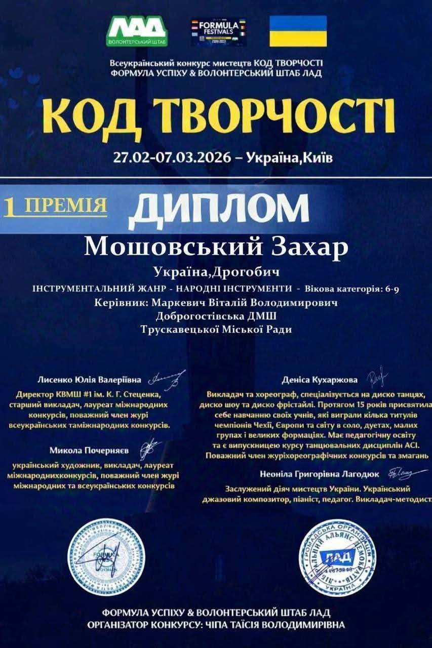 Вітаємо Мошовського Захара, талановитого учня Добро 1956гостівської Дитячої музичної школи, з блискучою перемогою на Всеукраїнському конкурсі мистецтв “КОД ТВОРЧОСТІ”! Його визнано гідним Диплома Першої Премії, що є надзвичайною відзнакою його наполегливої праці та музичного хисту. Це досягнення є яскравим свідченням високого рівня підготовки учнів Добро 1956гостівської ДМШ та майстерності викладачів.