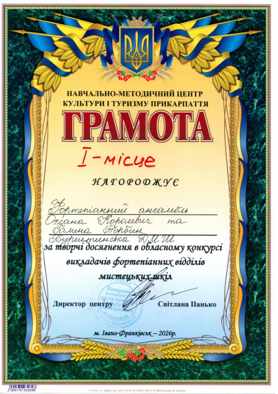Викладачі Королевич Оксана Романівна та Торбина Галина Федорівна, які представляють фортепіанні відділи мистецьких шкіл, завоювали 🥇перше місце на престижному обласному конкурсі. Змагання проходило на базі Калуської дитячої музичної школи, зібравши талановитих музикантів з усієї Івано-Франківщини.