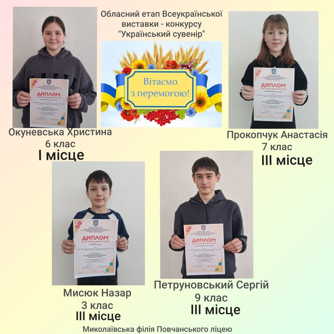 Миколаївська філія Повчанського ліцею відзначилася на обласному етапі Всеукраїнської виставки-конкурсу “Український сувенір”. Юні таланти продемонстрували свою майстерність та здобули заслужені нагороди, підтвердивши високий рівень творчої підготовки.