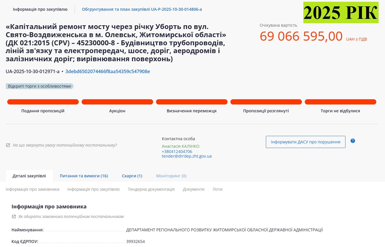 Наприкінці 2025 року відбувалася повторна спроба визначити підрядника: у тендері взяли участь два учасники. Втім, згідно з офіційним Звітом, договір про закупівлю не було укладено, адже обидва учасники «не відповідають умовам технічної специфікації та іншим вимогам щодо предмета закупівлі тендерної документації». Це ускладнило процес ремонту мосту в Олевську.