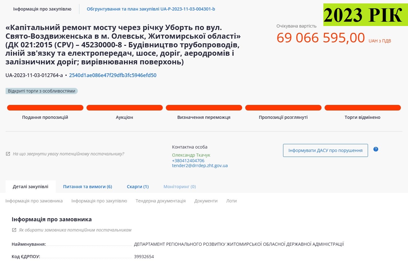 У 2023 році Департаментом регіонального розвитку Житомирської ОВА було оголошено процедуру закупівлі «Капітальний ремонт мосту через річку Уборть по вул. Свято-Воздвиженська в м. Олевськ Житомирської області» з очікуваною вартістю понад 69 мільйонів гривень. Однак, кошти так і не були виділені, тож закупівлю було відмінено на підставі «скорочення видатків на здійснення закупівлі товарів, робіт і послуг». Ця ситуація висвітлює бюрократичні перешкоди, що виникають під час реалізації важливих інфраструктурних проєктів.