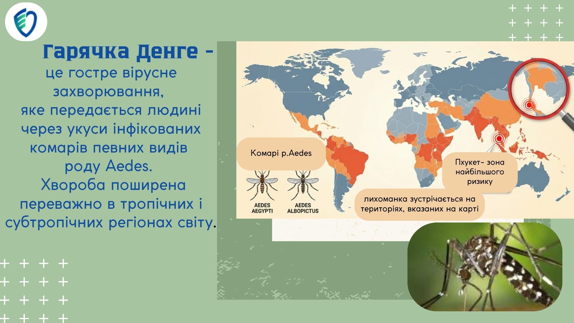Гарячка денге – це небезпечна вірусна інфекція, яка стрімко поширюється світом, головним чином через укуси комарів роду Aedes. За даними Всесвітньої організації охорони здоров’я, щорічно фіксуються мільйони випадків зараження. Майже половина населення планети перебуває під загрозою, особливо ті, хто подорожує до країн Азії, Африки, Латинської Америки та островів Індійського океану. Хоча в Україні гарячка денге не є ендемічною, випадки завезення вірусу серед мандрівників, які відвідували тропічні регіони, час від часу реєструються.