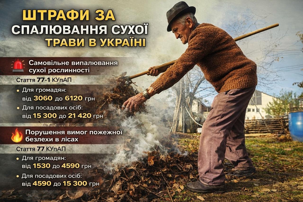 Спричинення шкоди довкіллю через самовільне випалювання сухої трави, листя та інших рослинних решток не лише заборонене законом, але й тягне за собою серйозну адміністративну відповідальність. Дотримання правил пожежної безпеки є запорукою збереження нашої природи та безпеки громадян.
