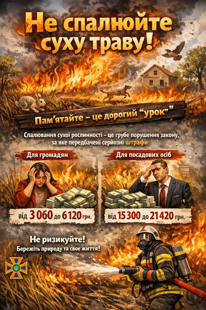 **Закликаємо всіх громадян!** Не паліть суху траву! Зберігайте природу, дбайте про довкілля та, найголовніше, бережіть своє життя та життя своїх близьких. Відповідальне ставлення до навколишнього середовища – це наша спільна місія.