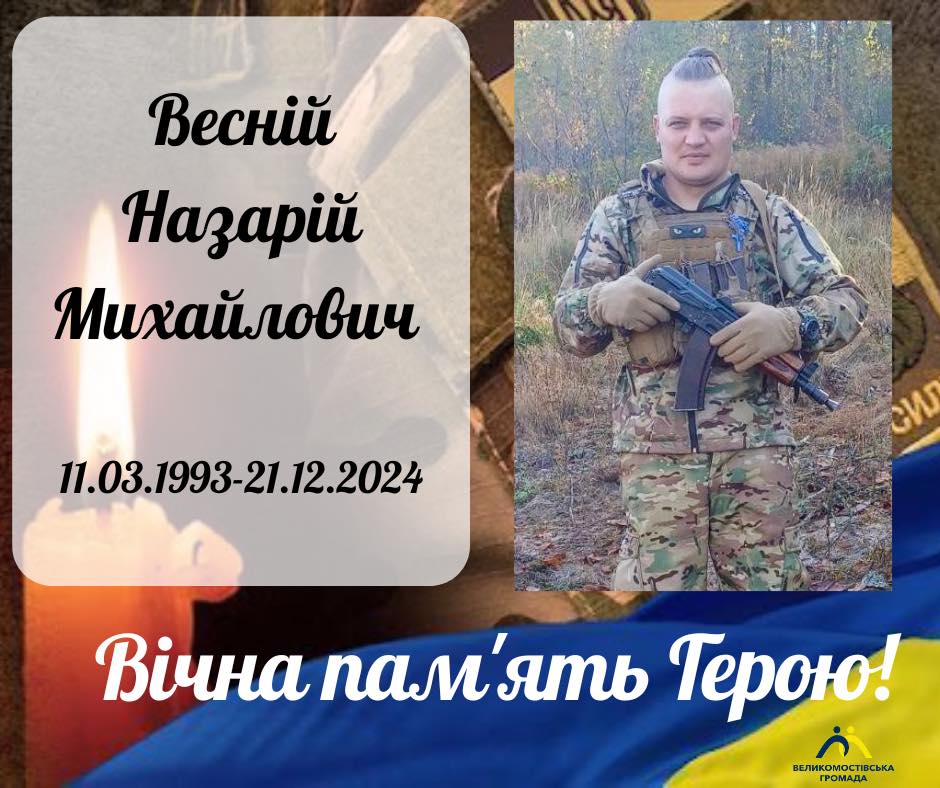 Дорога Великомостівська громадо… З невимовним болем повідомляємо надзвичайно гірку звістку. Ми втратили нашого Захисника — Назарія Веснія. Весній Назарій Михайлович, 1993 року народження, житель міста Великі Мости, який народився у селі Боянець, воїн десантно-штурмового батальйону військової частини А0284 (80-та десантно-штурмова бригада), мужньо виконуючи військовий обов’язок у бою за Україну, її свободу та незалежність, загинув 21 грудня 2024 року поблизу населеного пункту Руське Порічне Суджанського району Курської області російської федерації. З грудня 2024 року Назарій вважався зниклим безвісти… Для його родини це були довгі місяці болісного очікування, надії та боротьби. Його дружина Наталія не зупинялася ні на мить. Вона робила усе можливе, щоб знайти свого чоловіка: їздила на зустрічі, зверталася до різних установ, брала участь у мітингах та акціях на підтримку зниклих безвісти Захисників, шукала будь-яку інформацію, яка могла допомогти. Це були місяці безсонних ночей, сліз, молитов і віри у диво. Уся родина жила надією, що Назарій повернеться додому. На жаль, сьогодні стало відомо найболючіше… Назарій був справжнім воїном. Учасник бойових дій з 2014 року, він добре знав, що таке війна. Та коли розпочалося повномасштабне вторгнення, 25 лютого 2022 року добровільно став на захист України. Герой брав участь у найважчих боях цієї війни: у знищенні переправи окупантів через річку Сіверський Донець (травень 2022 року); у Харківському контрнаступі та звільненні Балаклії (вересень 2022 року); у запеклих боях за Бахмут, зокрема під час оборони та звільнення Кліщіївки у 2023 році; з серпня 2024 року виконував бойові завдання під час бойових дій у Курській області. Він був мужнім, відданим воїном, який до останнього подиху залишався вірним військовій присязі та Україні. Для рідних Назарій був передусім люблячим чоловіком, турботливим батьком, дорогим сином. У скорботі за Героєм залишається дружина Наталія, маленька донечка Яночка, батьки, брат та сестра Захисника, побратими, родина та близькі. Для співробітників Великомостівської міської ради це особливо болюча втрата. Ми були поруч із дружиною Захисника у ці довгі місяці невідомості, бачили її силу і віру, вона до останнього боролася за чоловіка, за надію знайти його. Назарій віддав найдорожче — своє життя за Україну, за свободу та майбутнє нашої держави, за мирне небо для кожного з нас. Про час і дату прибуття Героя «на щиті» до рідної громади, а також чин похорону буде повідомлено додатково. 🕯️Світла і вічна пам’ять Захиснику. Щирі співчуття родині, близьким та всім, хто знав і любив Назарія.