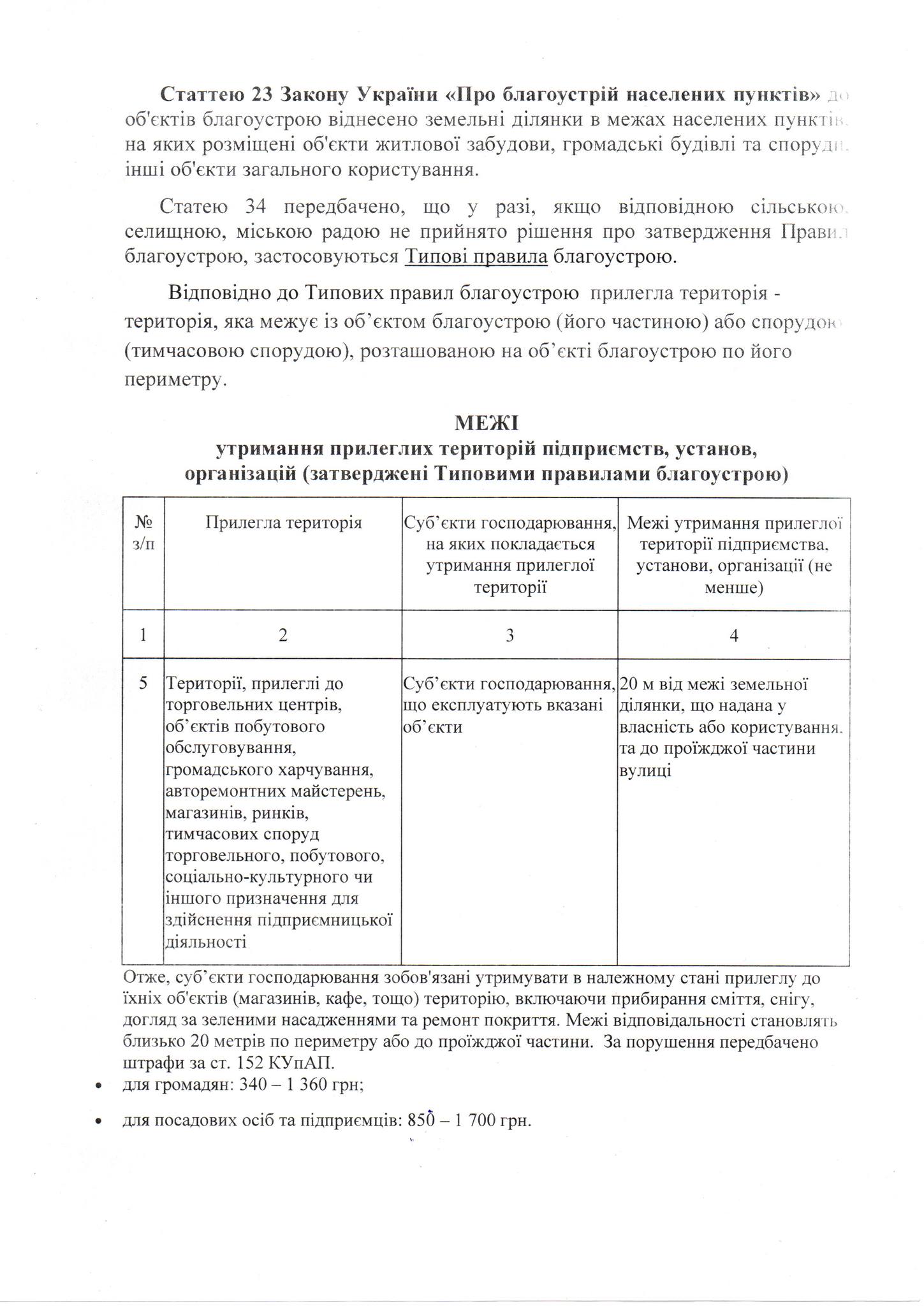 Нагадуємо, що відповідно до статті 10 та статті 21 Закону України «Про благоустрій населених пунктів», суб’єкти господарювання зобов’язані забезпечувати належний санітарний стан прилеглих територій.