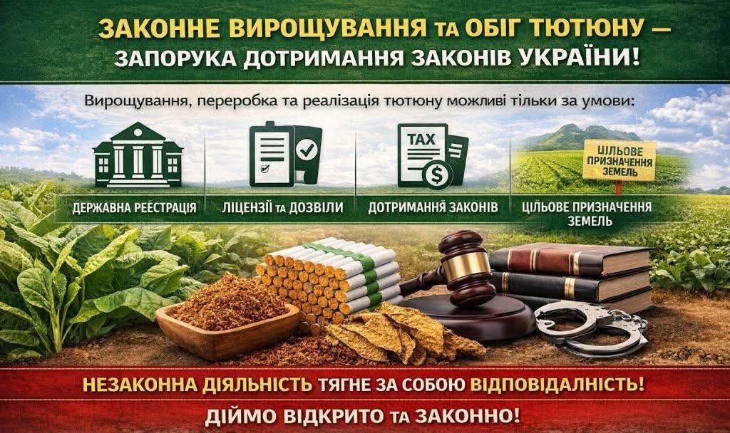 Звертаємо увагу всіх мешканців громади, сільськогосподарських виробників та суб’єктів господарювання на критичну важливість неухильного дотримання вимог законодавства України під час будь-якої діяльності, пов’язаної з вирощуванням, переробкою та реалізацією тютюну та тютюнової сировини. Держава посилює контроль за ринком тютюнової сировини, аби запобігти тінізації економіки, ухиленню від сплати податків та незаконному обігу підакцизної продукції. Тому діяльність, що стосується тютюну, має вестися виключно в межах чинного законодавства.