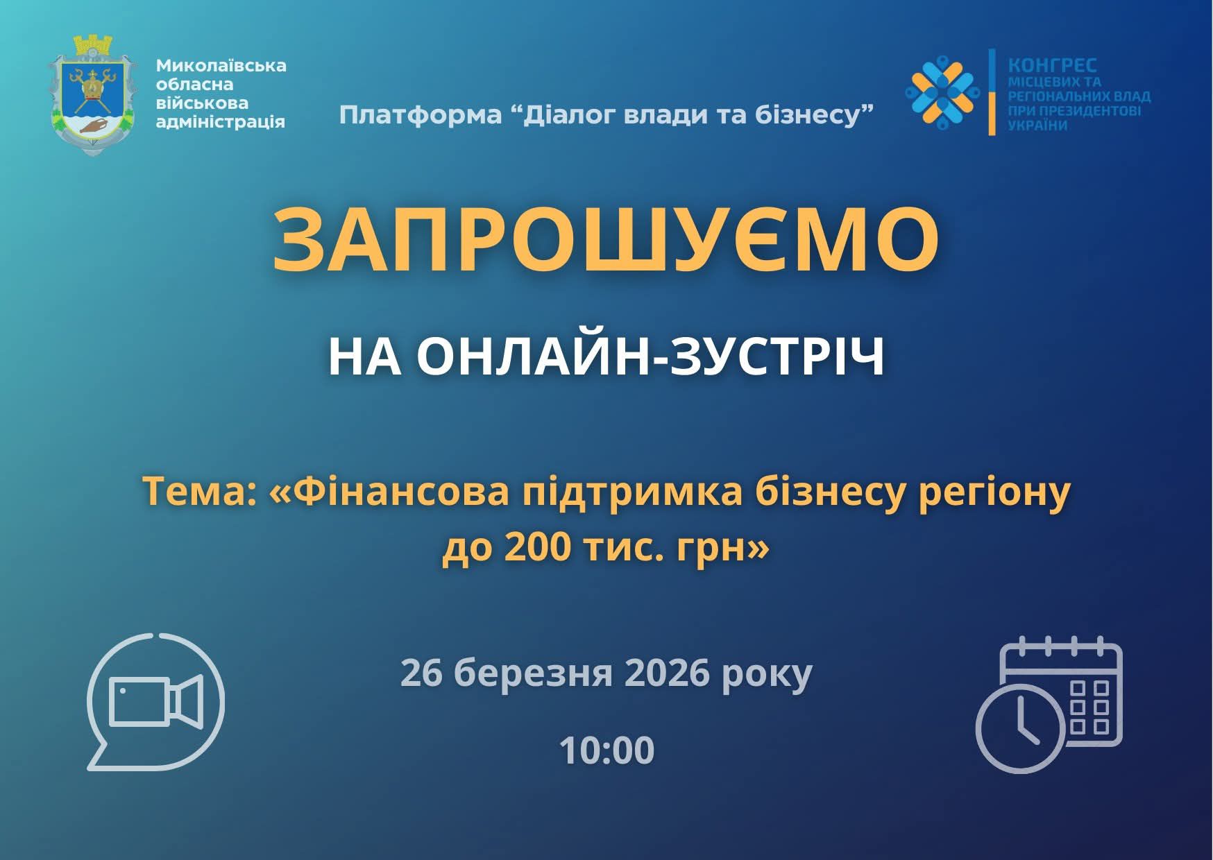 Представників бізнесу запрошують долучитися до важливої онлайн-зустрічі, присвяченої темі «Фінансова підтримка бізнесу регіону до 200 тис. грн». Ця ініціатива є частиною безперервного діалогу між владою та підприємницькою спільнотою, спрямованого на стимулювання економічного розвитку регіону.