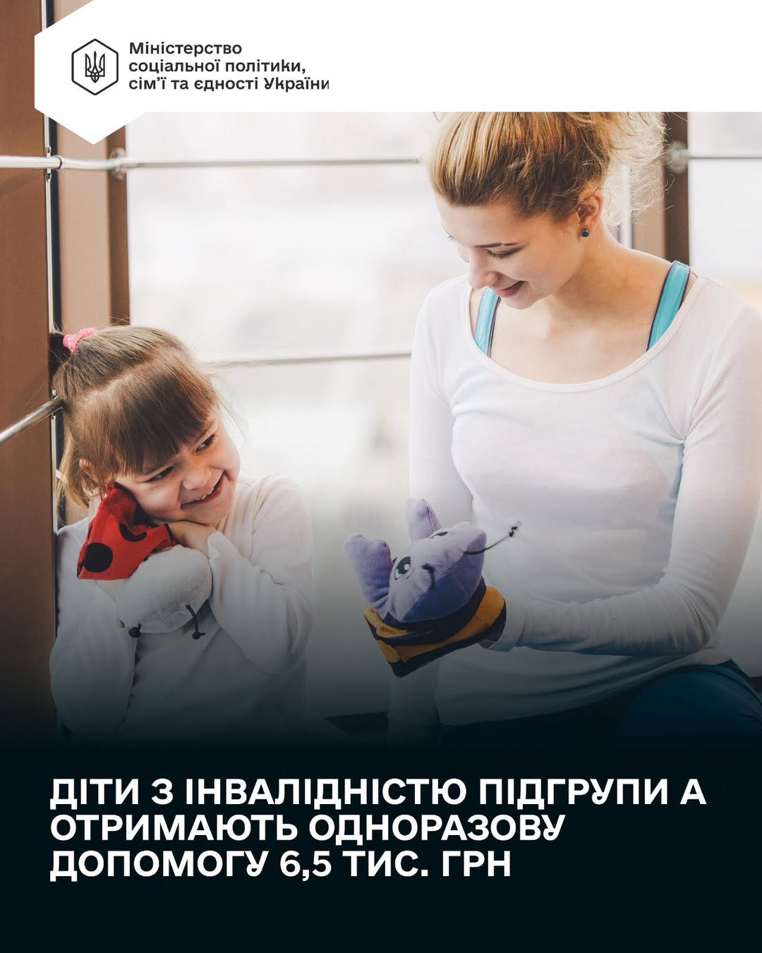 Діти з інвалідністю підгрупи А отримають одноразову допомогу 6,5 тис. грн. Це рі…