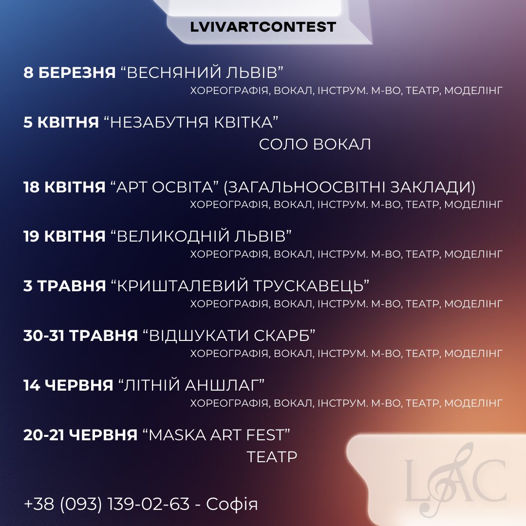 📞 Для отримання детальної інформації та реєстрації звертайтеся за телефоном: +38 (093) 13 90 263 — Софія. Не пропустіть свій шанс стати частиною цих незабутніх мистецьких подій!