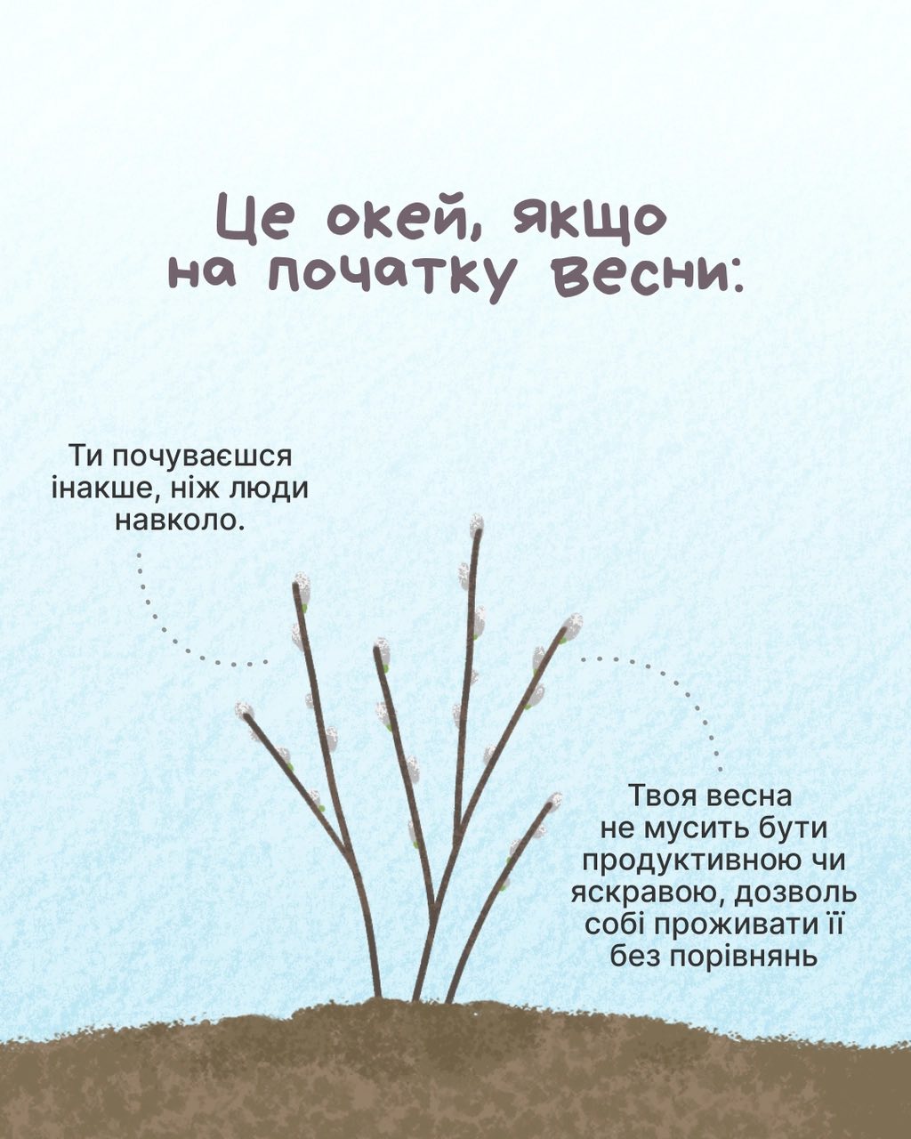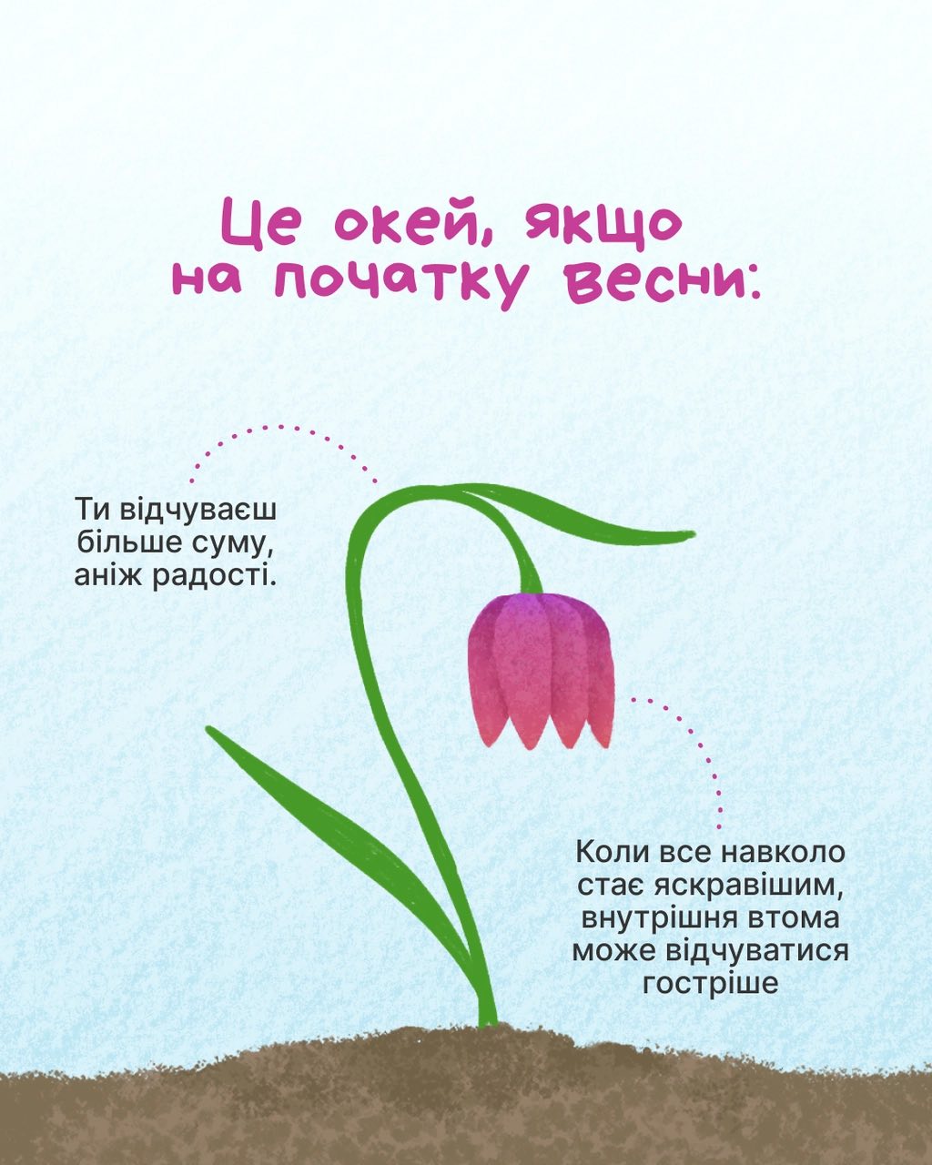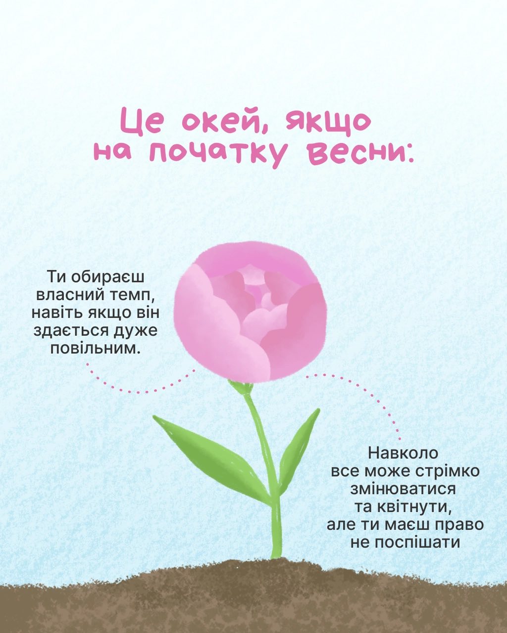Важливо пам’ятати, що турбота про себе — це не егоїзм, а необхідність. Дозвольте собі бути в будь-якому стані, рухатися у власному темпі та відчувати те, що ви відчуваєте, без осуду. Весна може бути викликом для багатьох, адже зміни в тривалості світлового дня та погоді можуть впливати на самопочуття, викликаючи сезонну втому або апатію. Це явище відоме як весняна втома, і воно не є ознакою слабкості чи браку мотивації. Ваш внутрішній стан є таким же важливим, як і зовнішні обставини, і потребує уваги та розуміння.